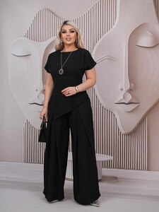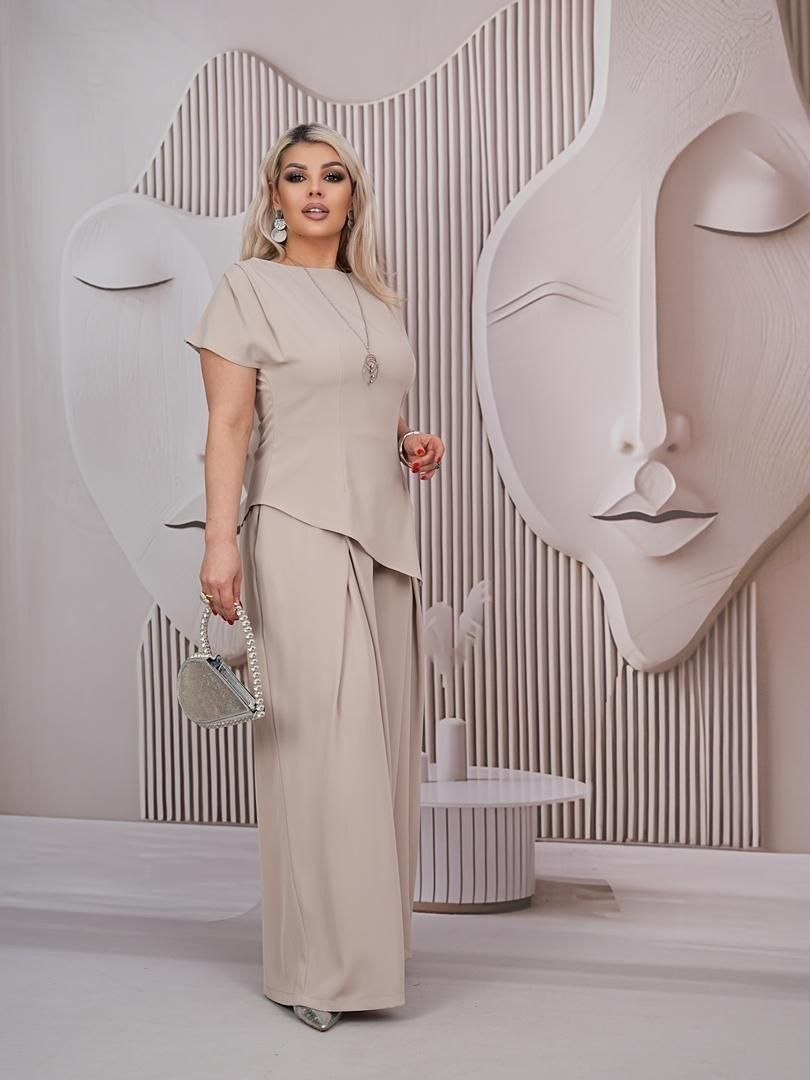 Стильний костюм двійка, блуза з асиметричним кроєм - візуально витягує силует. Вільні брюки, що струмують, палаццо,талія на резинці,висока посадка.