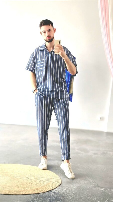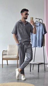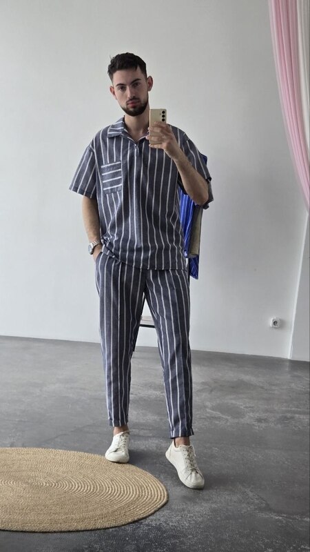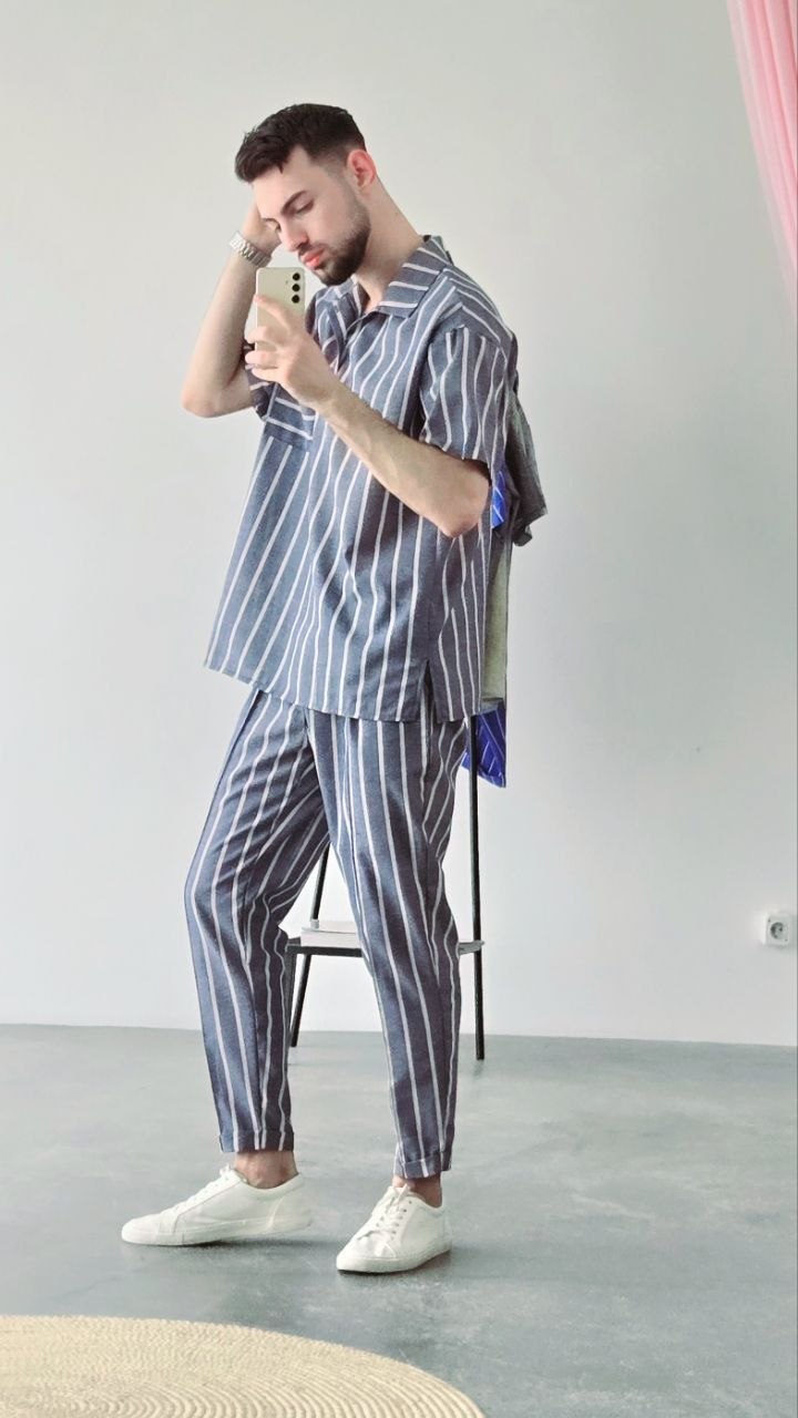 Сорочка з комірцем та накладною кишенею.Штани з еластичним поясом і шнурком.