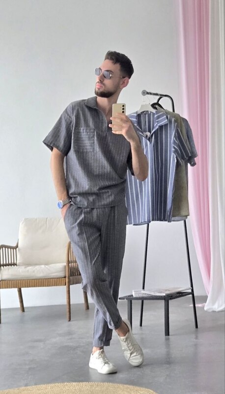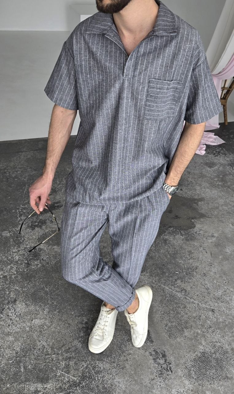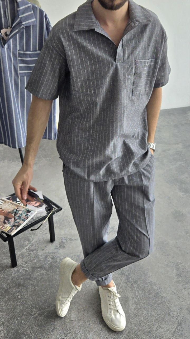 Сорочка з комірцем та накладною кишенею.Штани з еластичним поясом і шнурком.