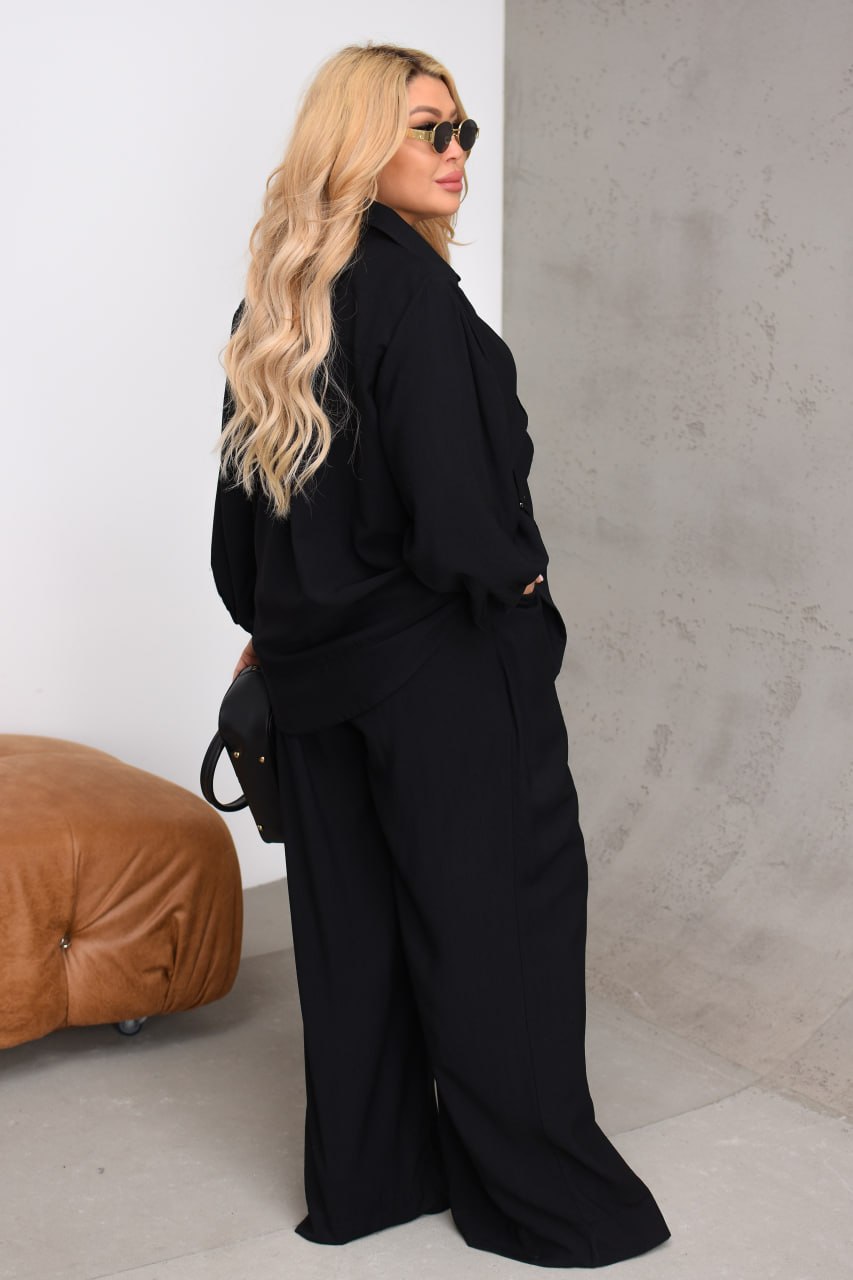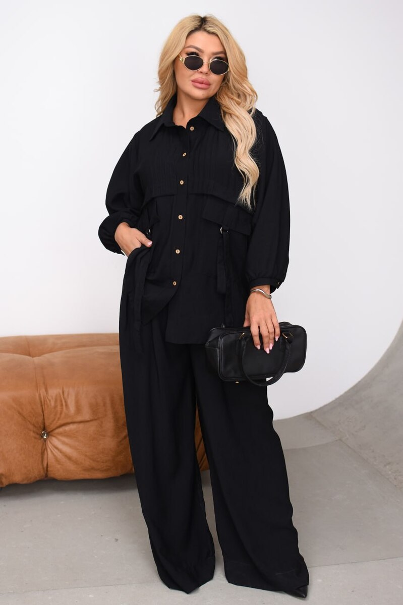 Вишуканий костюм, що поєднує комфорт, практичність і сучасний дизайн. Ідеальний вибір для повсякденних образів, роботи або стильних виходів — виглядає легко, але водночас елегантно.Сорочка вільного крою з накладними кишенями, декорованими клапанами зі стрічками, які плавно переходять до низу виробу та додають образу оригінальності. Перед оздоблений делікатними складками (“гармошкою”) в зоні грудей, що створює м’який, жіночний акцент.Застібається на ґудзики, рукав 3/4 із фіксацією на ґудзик — зручно та практично для щоденного носіння.Штани вільного крою з високою посадкою та еластичною резинкою на поясі забезпечують комфорт протягом усього дня. Бічні кишені додають практичності, а легкий силует виглядає сучасно та невимушено.Костюм легко комбінується як із класичним взуттям, так і з casual-варіантами — універсальна база гардероба.