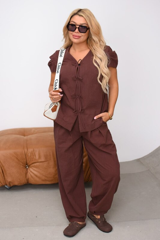 Вишуканий брючний костюм, який гармонійно поєднує жіночність, комфорт і актуальний дизайн. Ідеально підходить як для офісу, так і для особливих подій — виглядає стримано, але водночас ефектно. Жакет вільного крою з коротким рукавом зі складками, м’яко прилягає до руки та формує акуратний об’єм. Особливий акцент — декоративні застібки-бантики, що створюють ніжний, елегантний настрій, при цьому під верхнім бантом прихований робочий ґудзик для зручності. Штани із середньою посадкою та еластичною резинкою ззаду на поясі забезпечують комфорт протягом усього дня. Вільна штанина з декоративними защипами внизу формує акуратний силует, а укорочена довжина виглядає сучасно та стильно.