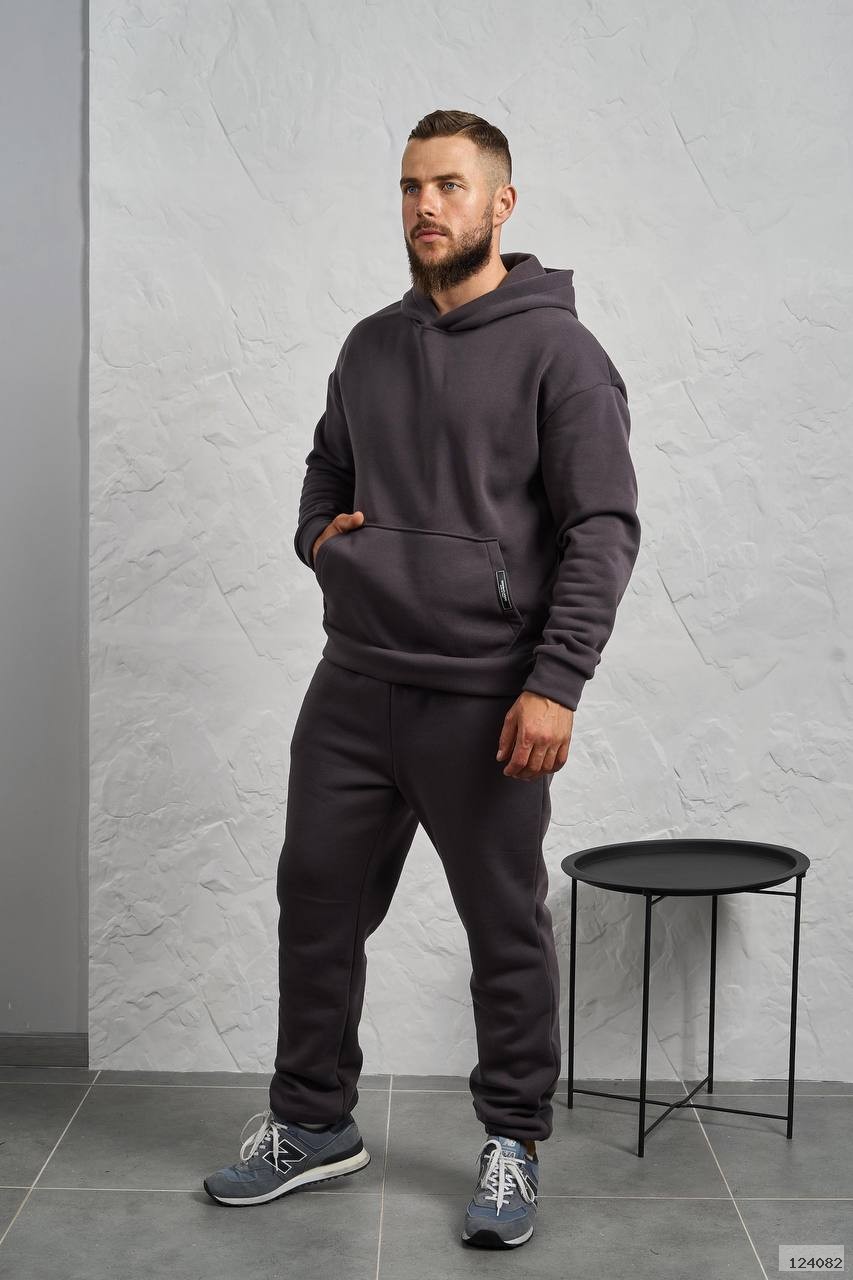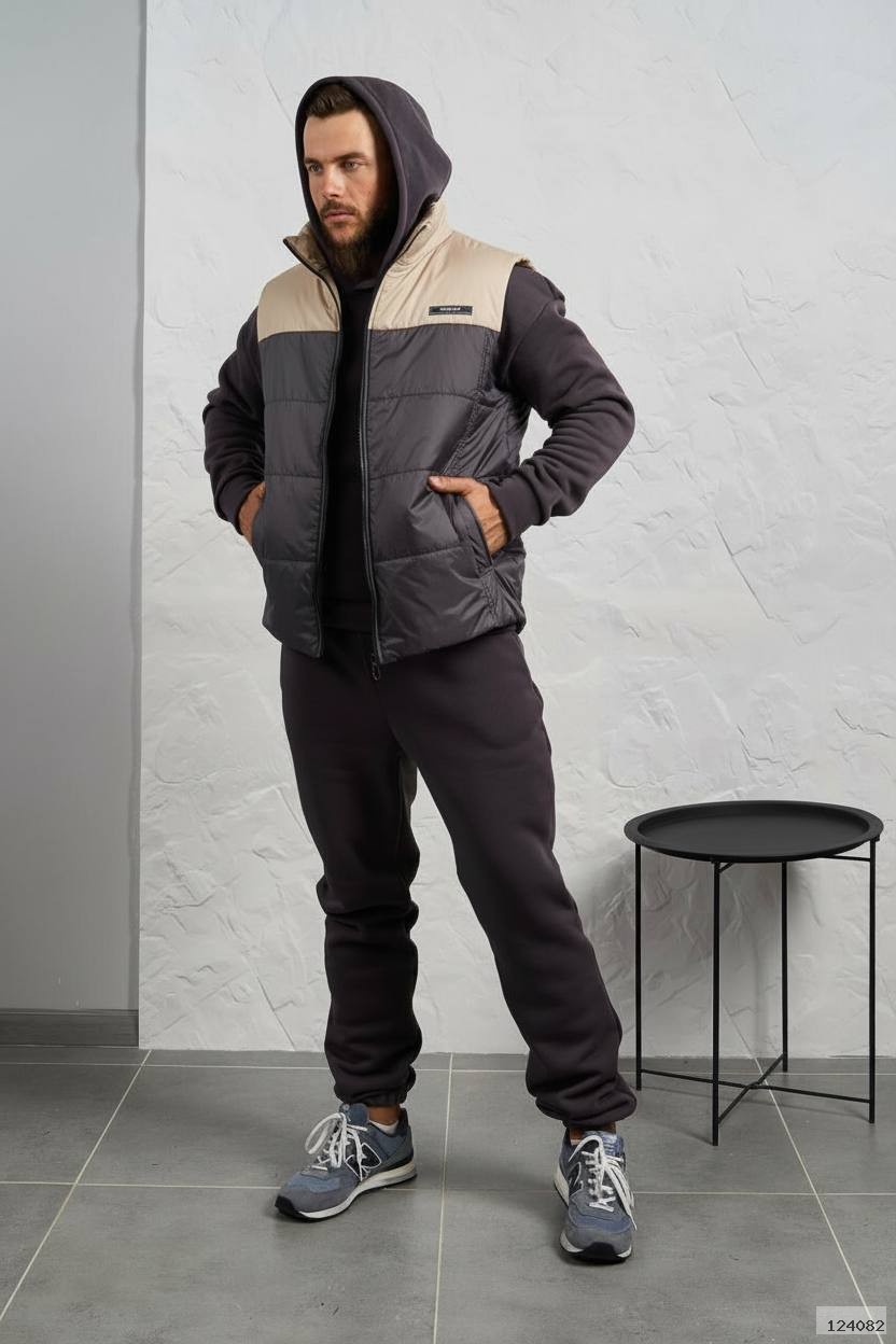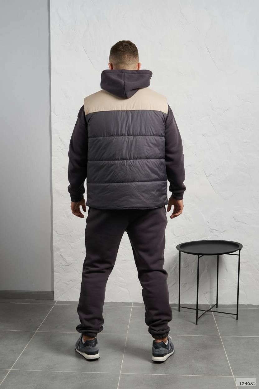 Стильний чоловічий комплект для прохолодної погоди. Складається з утепленого жилета та зручного теплого спортивного костюма, з кишенею кенгуру, збоку прикрашен нашивкою, з капюшоном. Рукава на манжетах. Штани прямі, висока посадка з кишенями, і знизу на гумці. Жилет