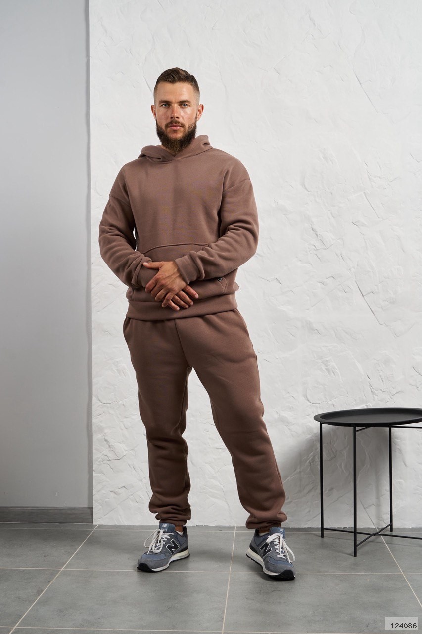 Стильний чоловічий комплект для прохолодної погоди. Складається з утепленого жилета та зручного теплого спортивного костюма, з кишенею кенгуру, збоку прикрашен нашивкою, з капюшоном. Рукава на манжетах. Штани прямі, висока посадка з кишенями, і знизу на гумці. Жилет