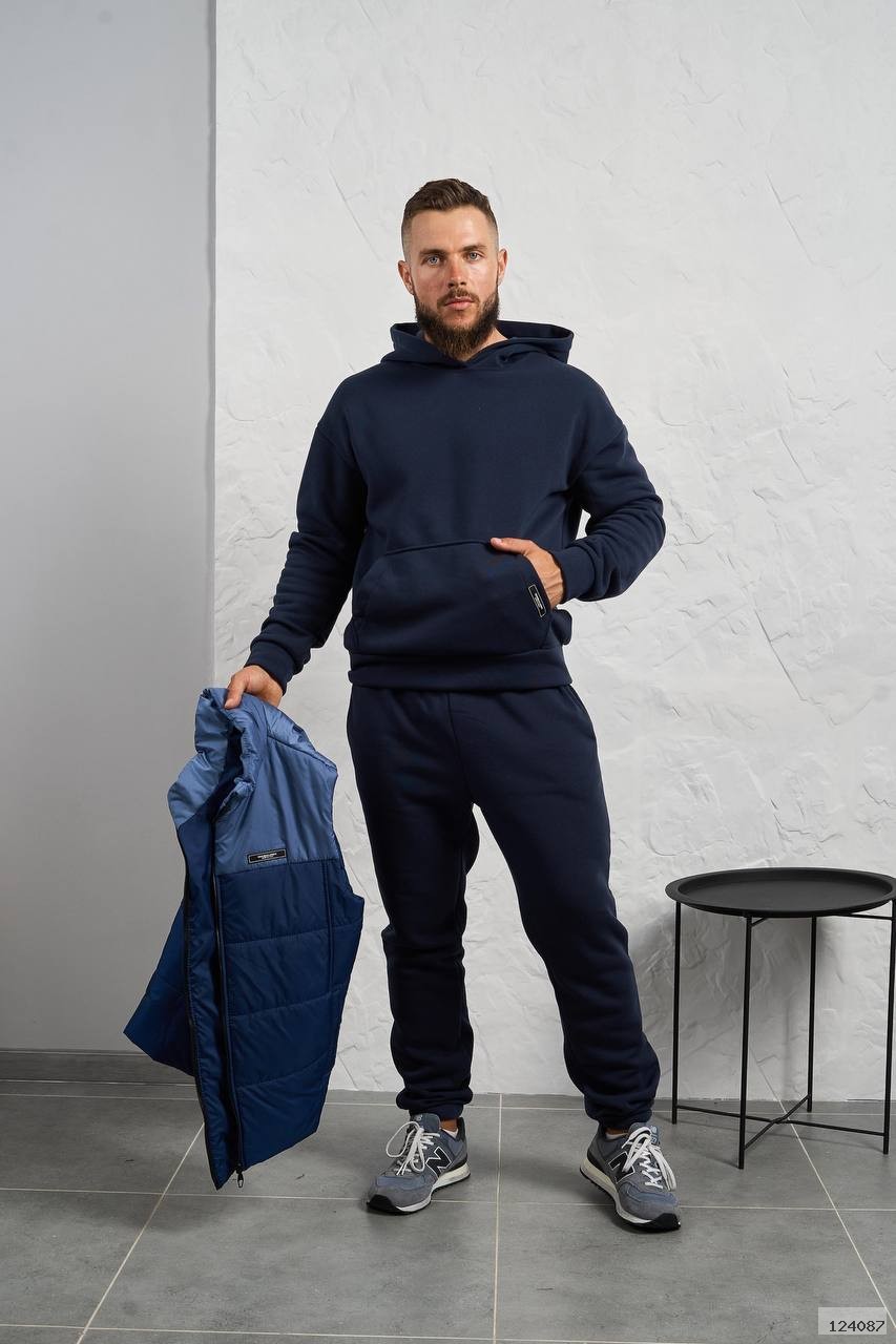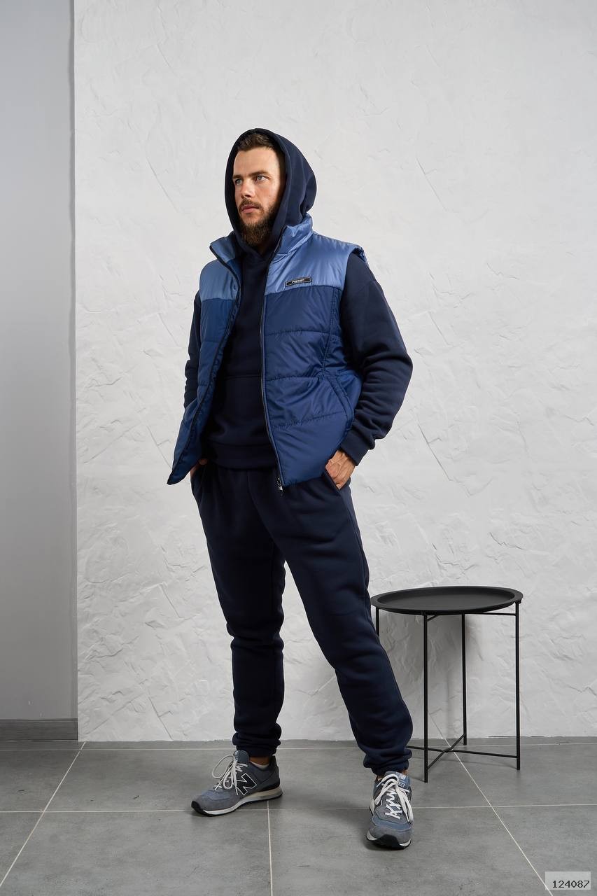 Стильний чоловічий комплект для прохолодної погоди. Складається з утепленого жилета та зручного теплого спортивного костюма, з кишенею кенгуру, збоку прикрашен нашивкою, з капюшоном. Рукава на манжетах. Штани прямі, висока посадка з кишенями, і знизу на гумці. Жилет