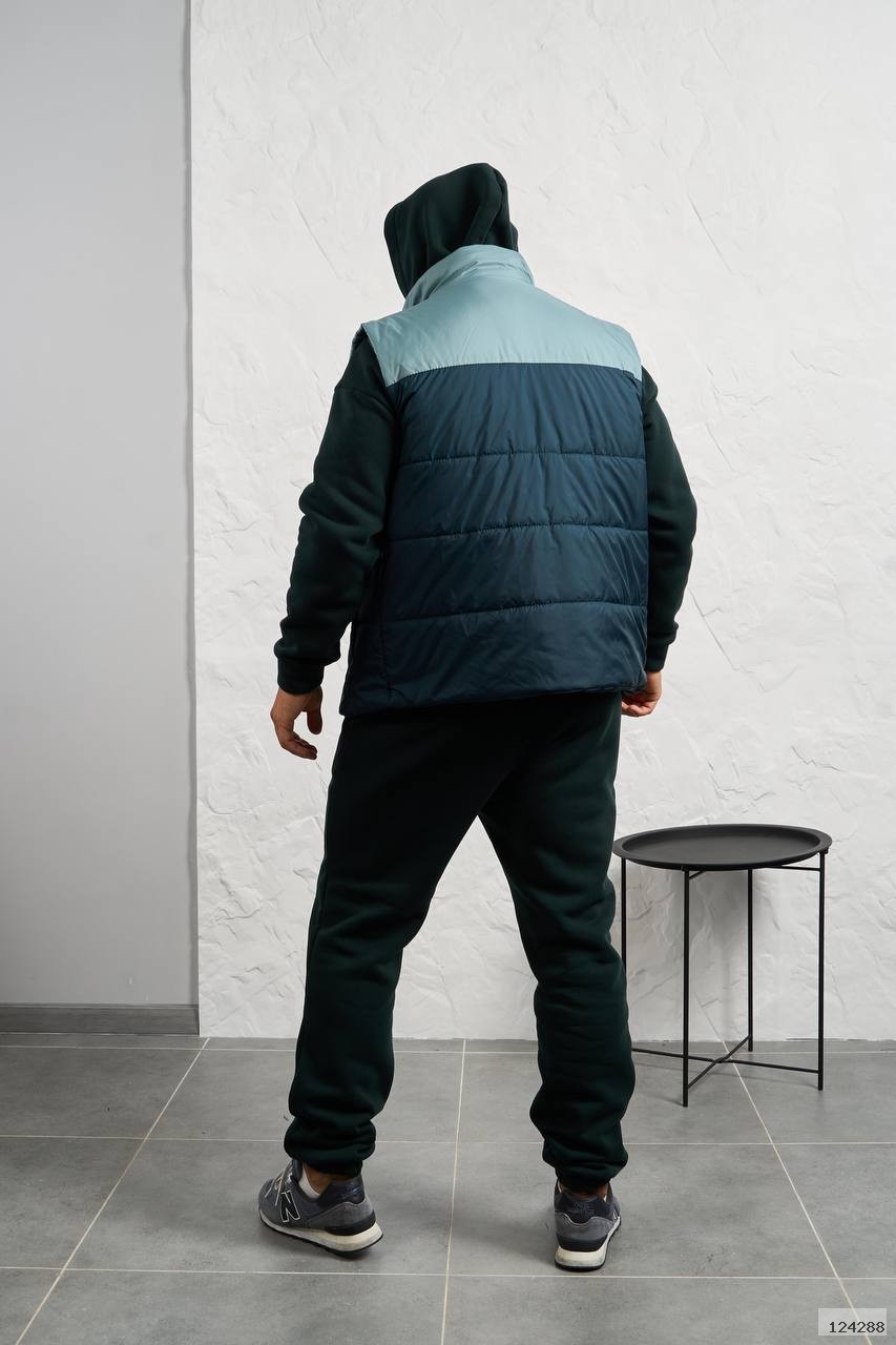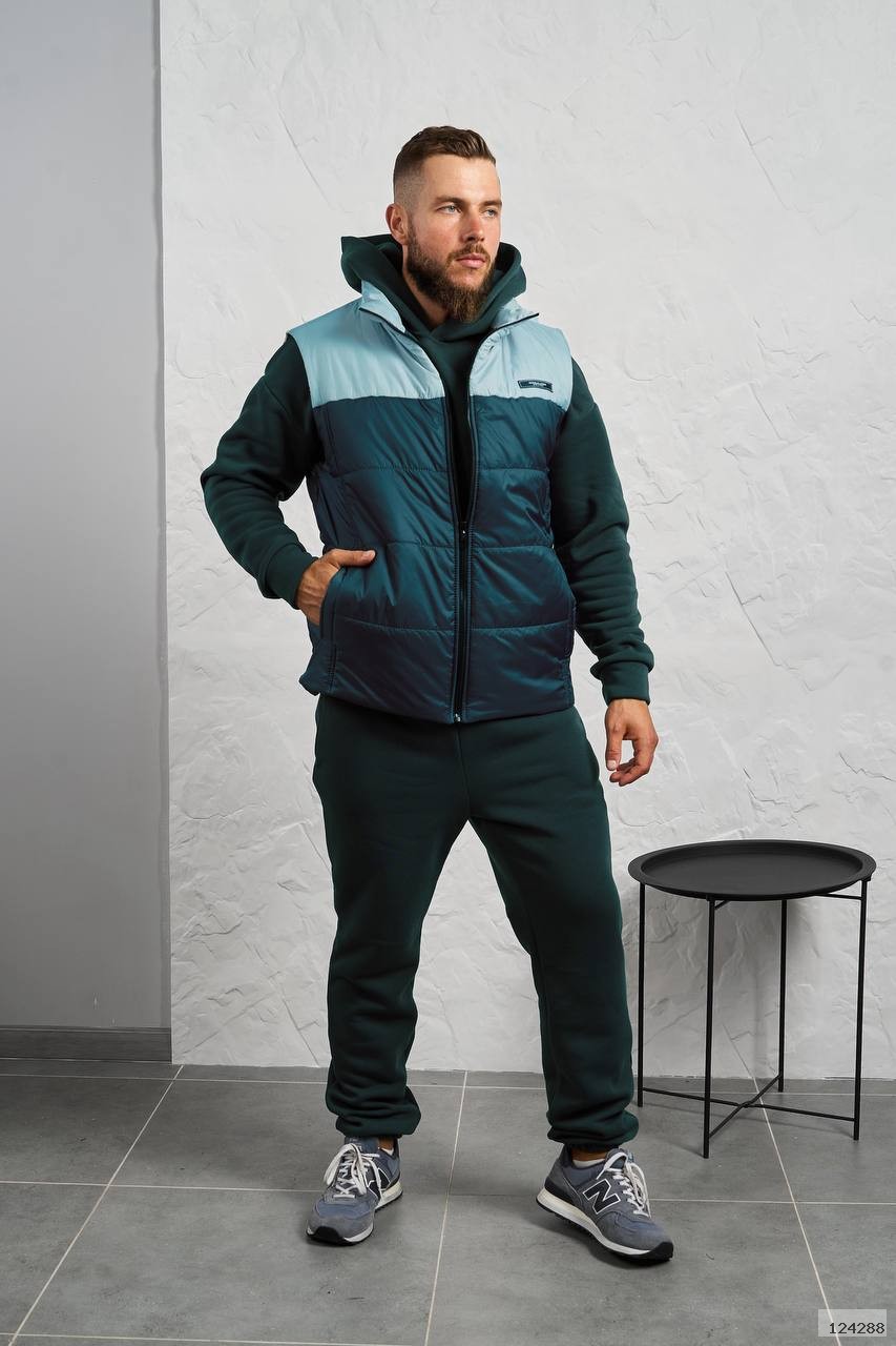 Стильний чоловічий комплект для прохолодної погоди. Складається з утепленого жилета та зручного теплого спортивного костюма, з кишенею кенгуру, збоку прикрашен нашивкою, з капюшоном. Рукава на манжетах. Штани прямі, висока посадка з кишенями, і знизу на гумці. Жилет