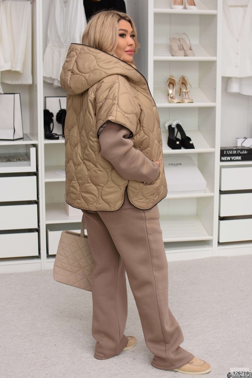 Теплий костюм-трійка прослугує вам декілька років : стьоганий жилет з цікавим, оригінальним візерунком, глибокий капюшон , спущений рукав -реглан , жилет застібається на робочі ґудзики в колір основи , з боків неробочі ґудзики, кишені на молнії .