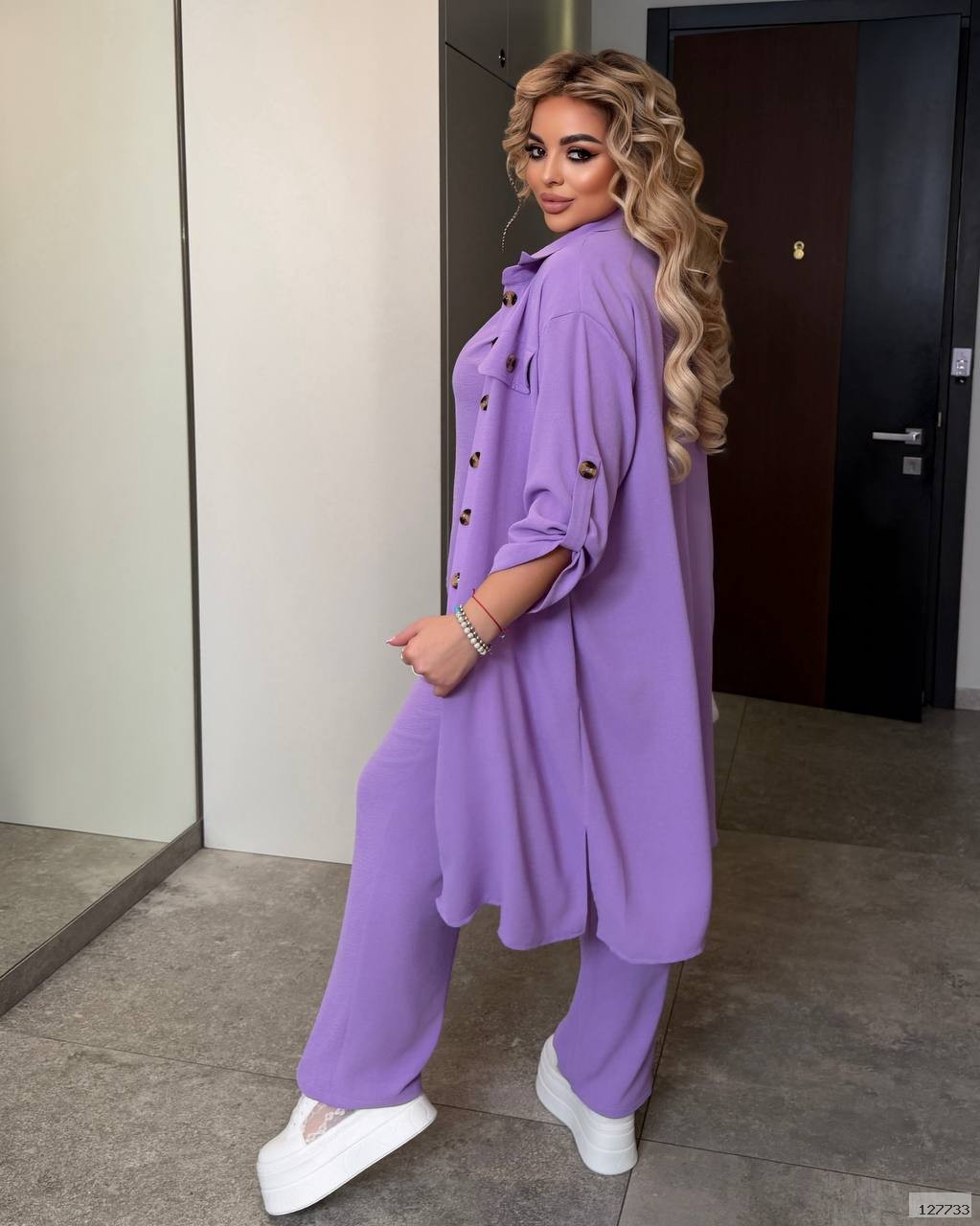 Костюм-трійка з оригинальним накатом, всі три деталі гардеробу можливо носити окремо: блуза з якісним накатом, як на фото, по низу з обох боків розрізи ; брюки на широкій резинці , з боків кишені; подовжена сорочка , застібається на ґудзики , рукав на патику с ґудзиком ( довжину можливо регулювати), на грудях неробочі кишені с ґудзиком, з боків сорочки робочі кишені.