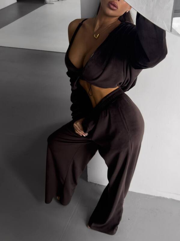 Костюм-трійка, що поєднує комфорт і трендовий вигляд. Легкий бра-топ, вільні штани та кофта на замку створюють ідеальний сет на кожен день. Велюр ніжний на дотик і виглядає дорого, а фасон підкреслює фігуру та водночас дарує свободу рухів.