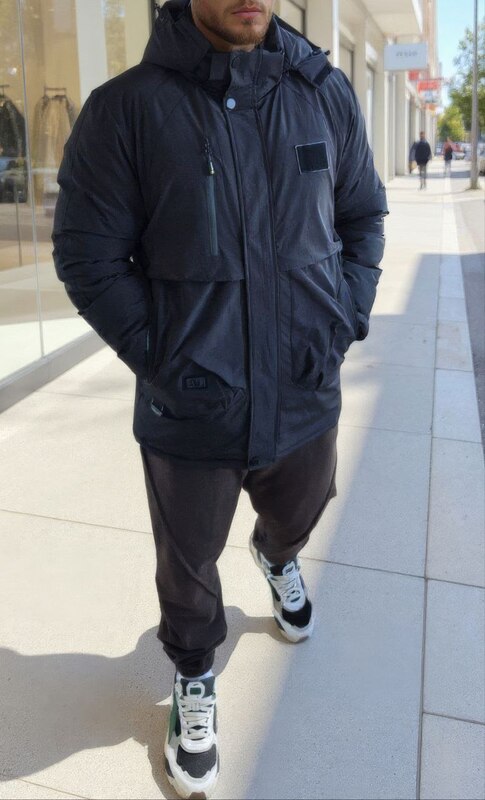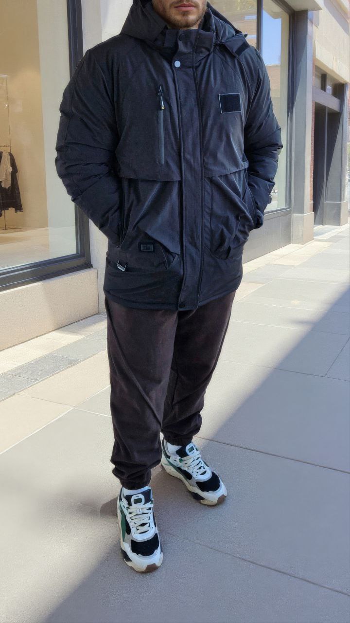 Куртка з високим коміром і знімним капюшоном на блискавці. Прямий силует,центральна застібка-блискавка з кнопками,місткі кишені та якісна фурнітура.