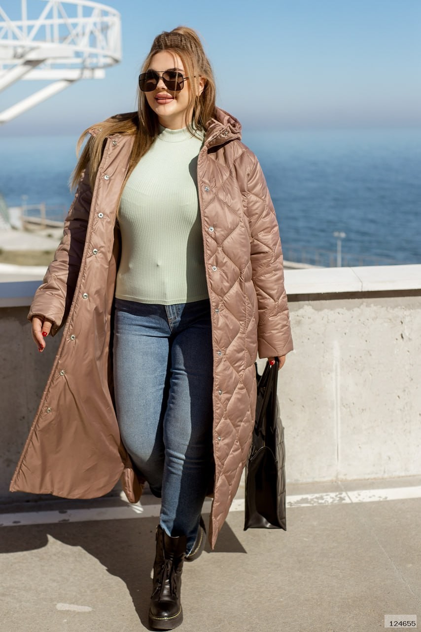 Довга стьобана куртка з пришивним капюшоном, високим коміром і довгими рукавами. Такий варіант курток майорить на стильних фешн показах вже другий рік та досі не втрачає своєї популярності. Куртка застібається на ряд кнопок спереду. Ми додали також накладні кишені на основній частині виробу. Така куртка легко поєднується з будь-якими елементами гардеробу, а також в ній буде однозначно тепло, адже ми додали наповнювач синтепон 200 та силікон.