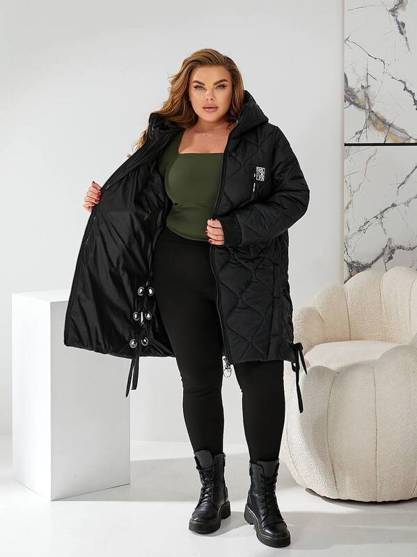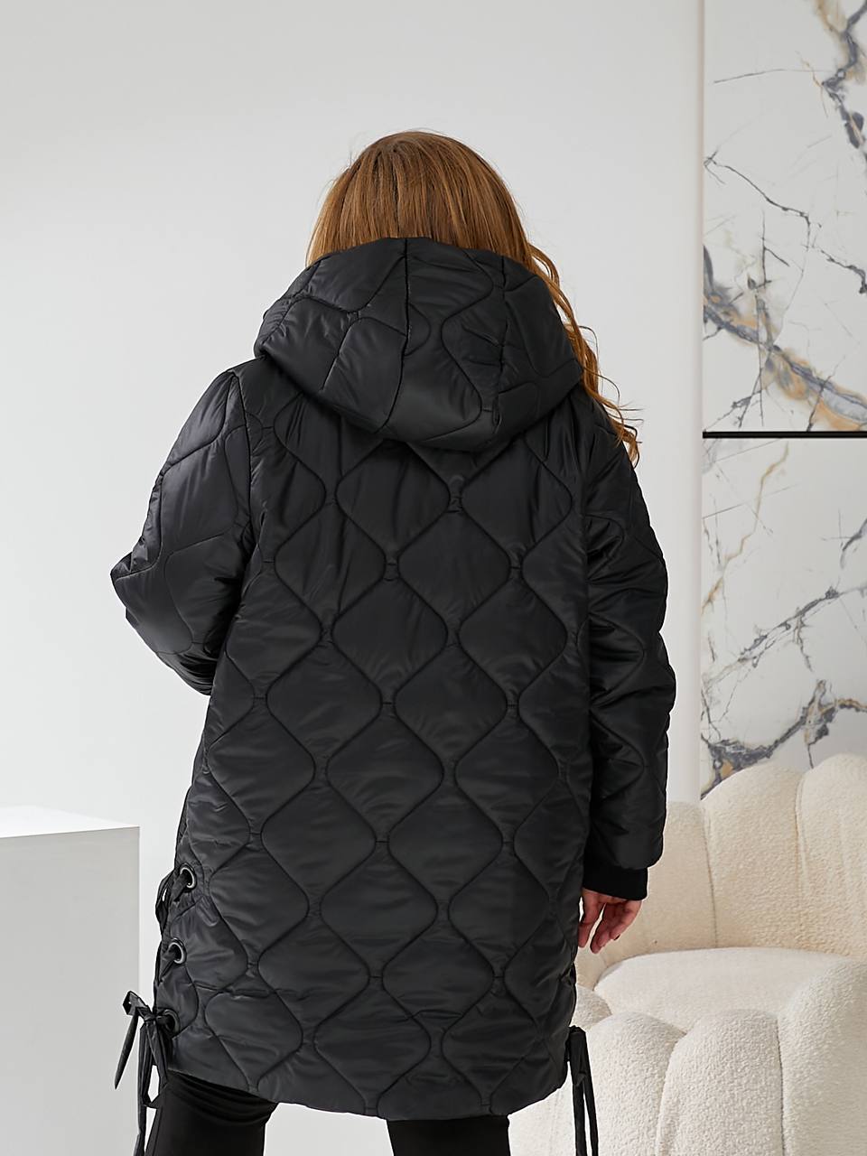 Стильна стьобана куртка цікавого крою із зав'язками з боків, глибокий зручний капюшон, кишені, манжети.