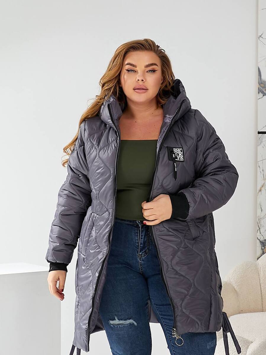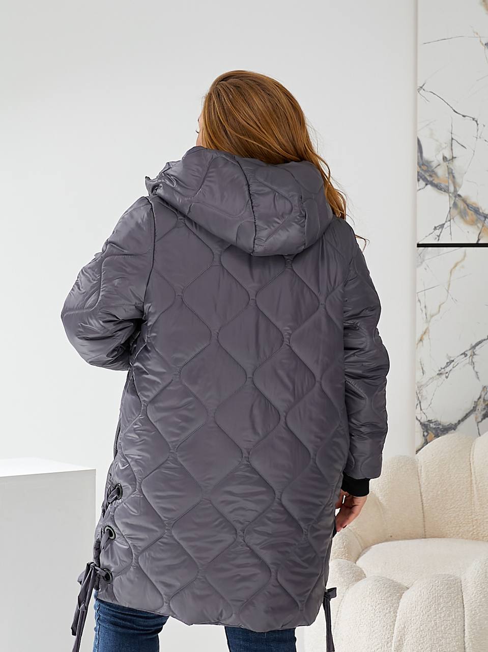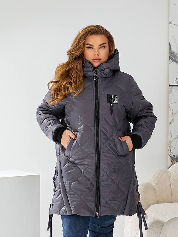 Стильна стьобана куртка цікавого крою із зав'язками з боків, глибокий зручний капюшон, кишені, манжети.