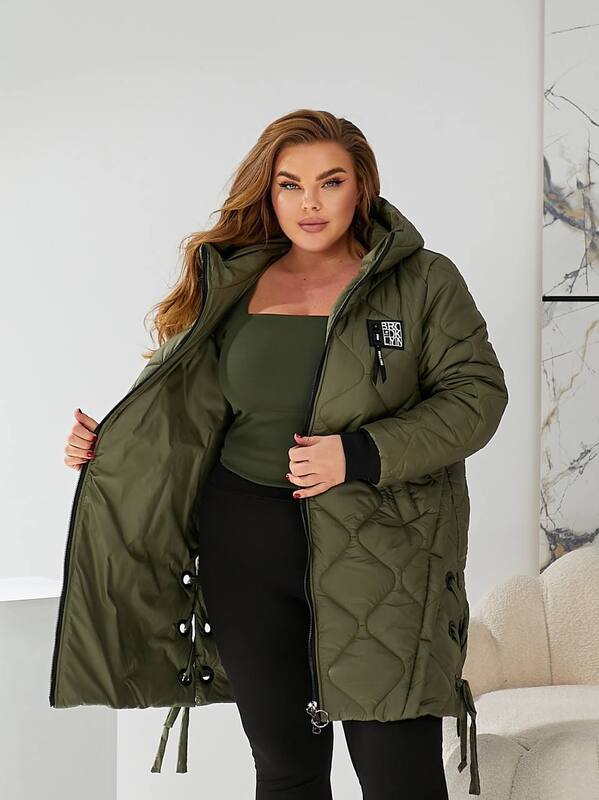 Стильна стьобана куртка цікавого крою із зав'язками з боків, глибокий зручний капюшон, кишені, манжети.