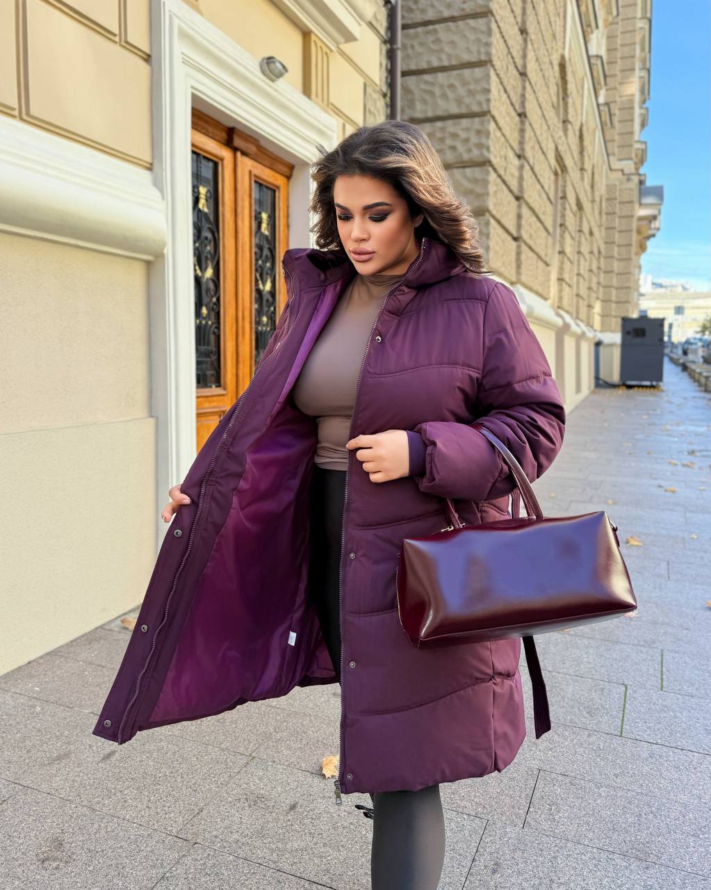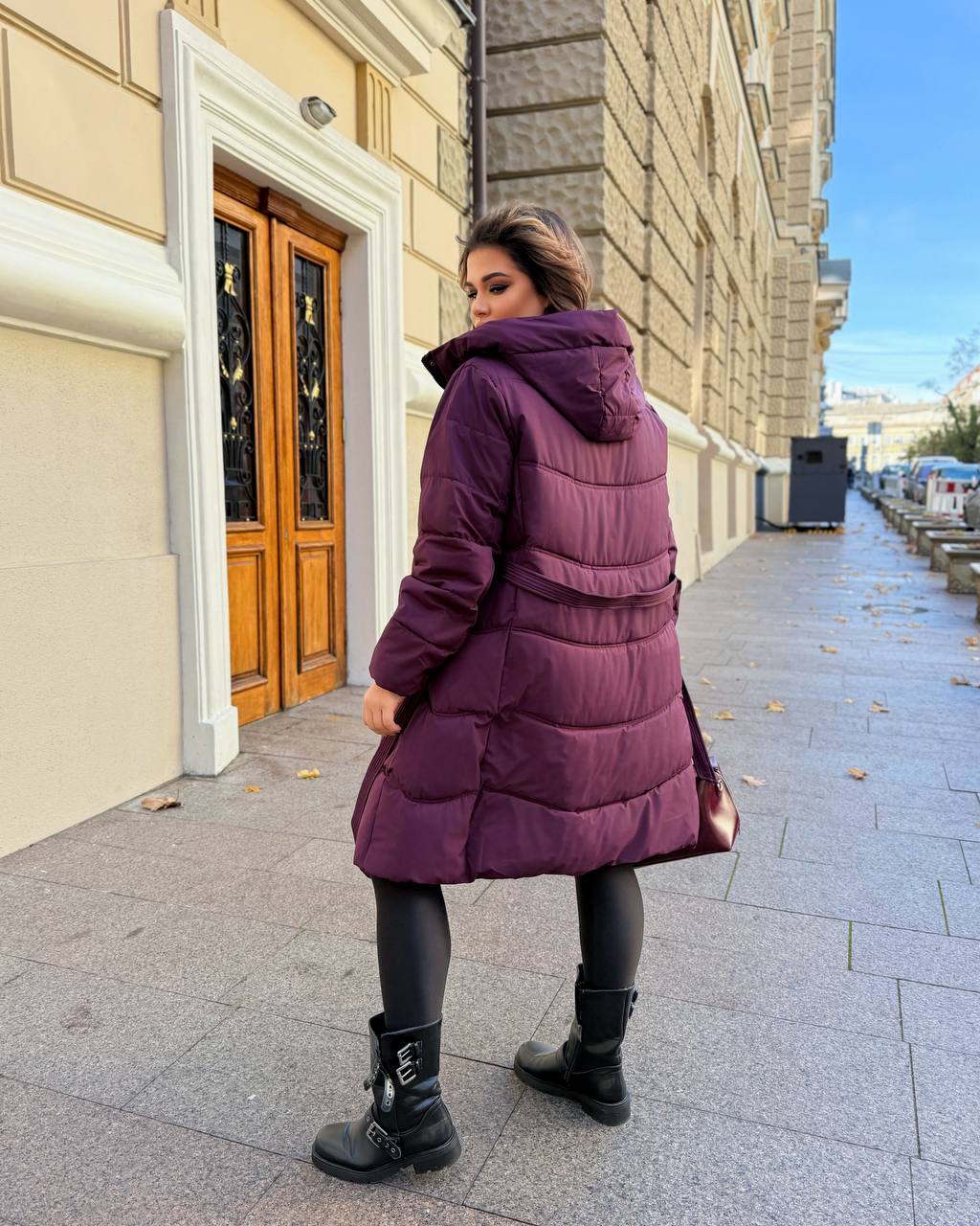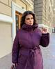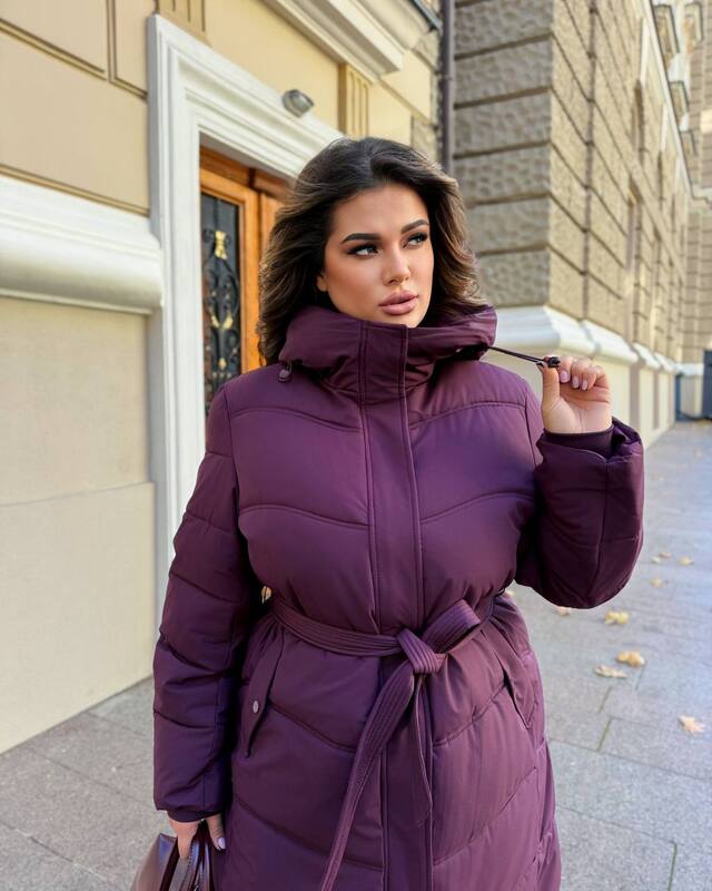 Подовжена тепла куртка з капюшоном.Має зручні бічні кишені та центральну блискавку,доповнену кнопками.У комплекті є пояс,який підкреслює талію.