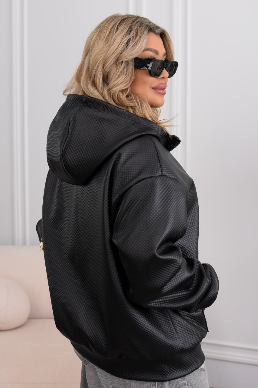 Демісезонна куртка-бомбер must have: капюшон, водонепроникна еко-шкіра, два накладні кармани, підкладка. Мінімалізм, що тримає форму та рятує від вітру й дощу