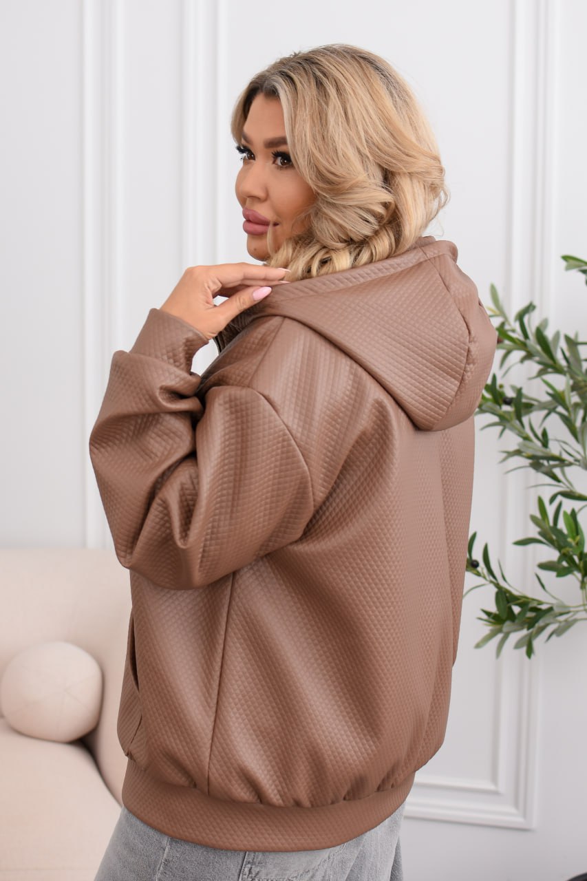 Демісезонна куртка-бомбер must have: капюшон, водонепроникна еко-шкіра, два накладні кармани, підкладка. Мінімалізм, що тримає форму та рятує від вітру й дощу