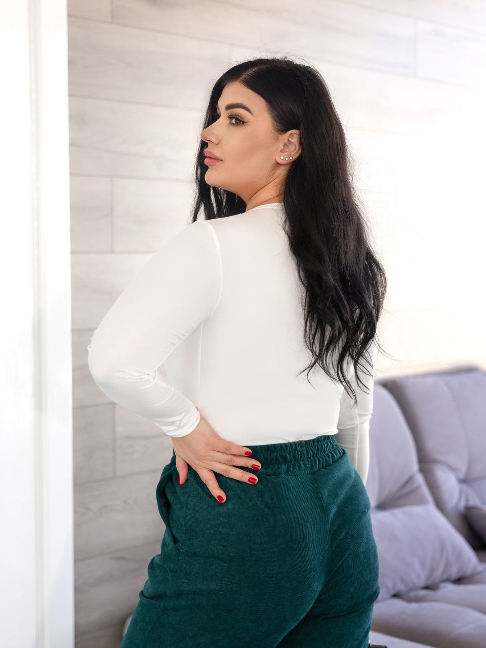 Лонгслів гарно облягає фігуру, підкреслюючи силует та не сковуючи рухи