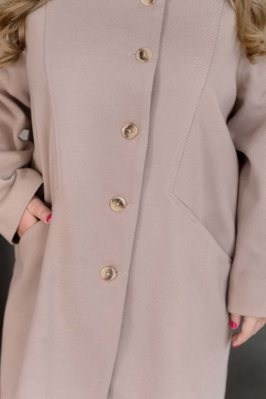 Вільний крій дарує легкість і свободу рухів, а комір-стійка додає образу елегантної стриманості. Стильний декоративний шов підкреслює силует і надає особливого шарму. Довгі рукава створюють гармонійний баланс, а зручні кишеньки та класична застібка на ґудзики роблять пальто не лише красивим, а й неймовірно практичним.