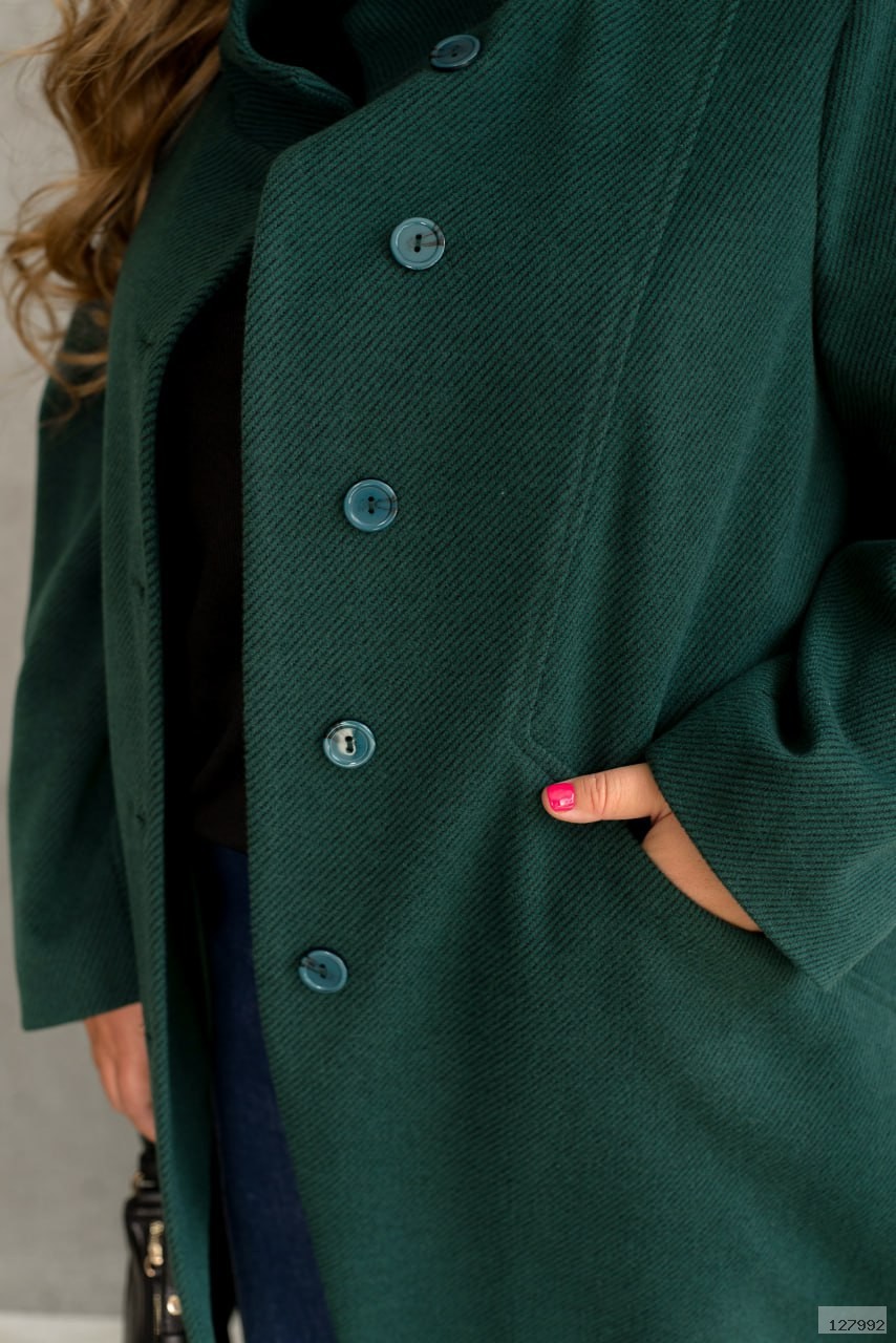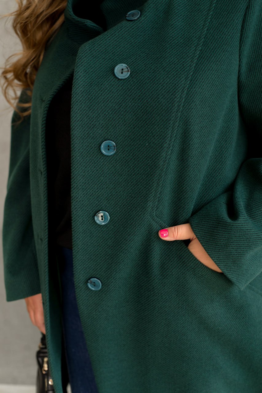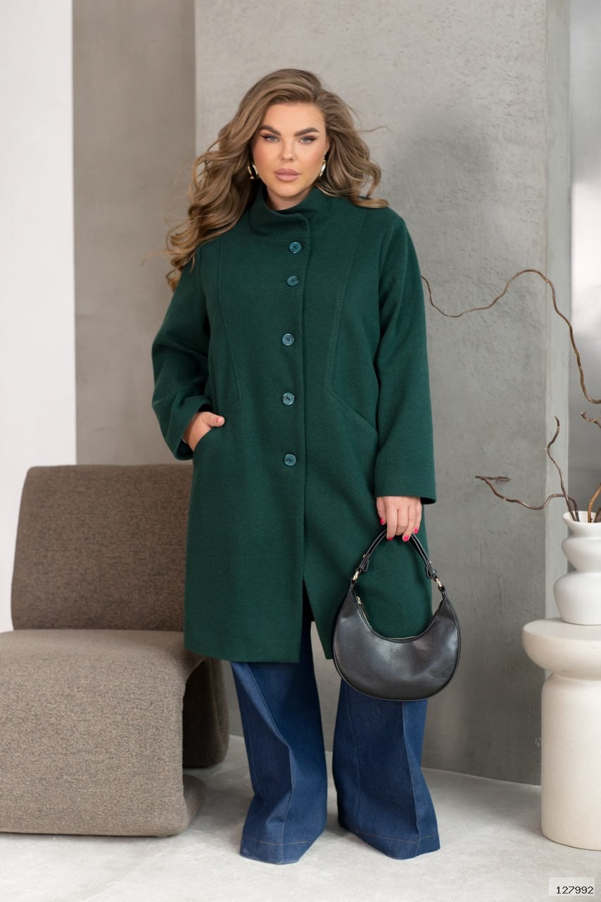 Вільний крій дарує легкість і свободу рухів, а комір-стійка додає образу елегантної стриманості. Стильний декоративний шов підкреслює силует і надає особливого шарму. Довгі рукава створюють гармонійний баланс, а зручні кишеньки та класична застібка на ґудзики роблять пальто не лише красивим, а й неймовірно практичним.