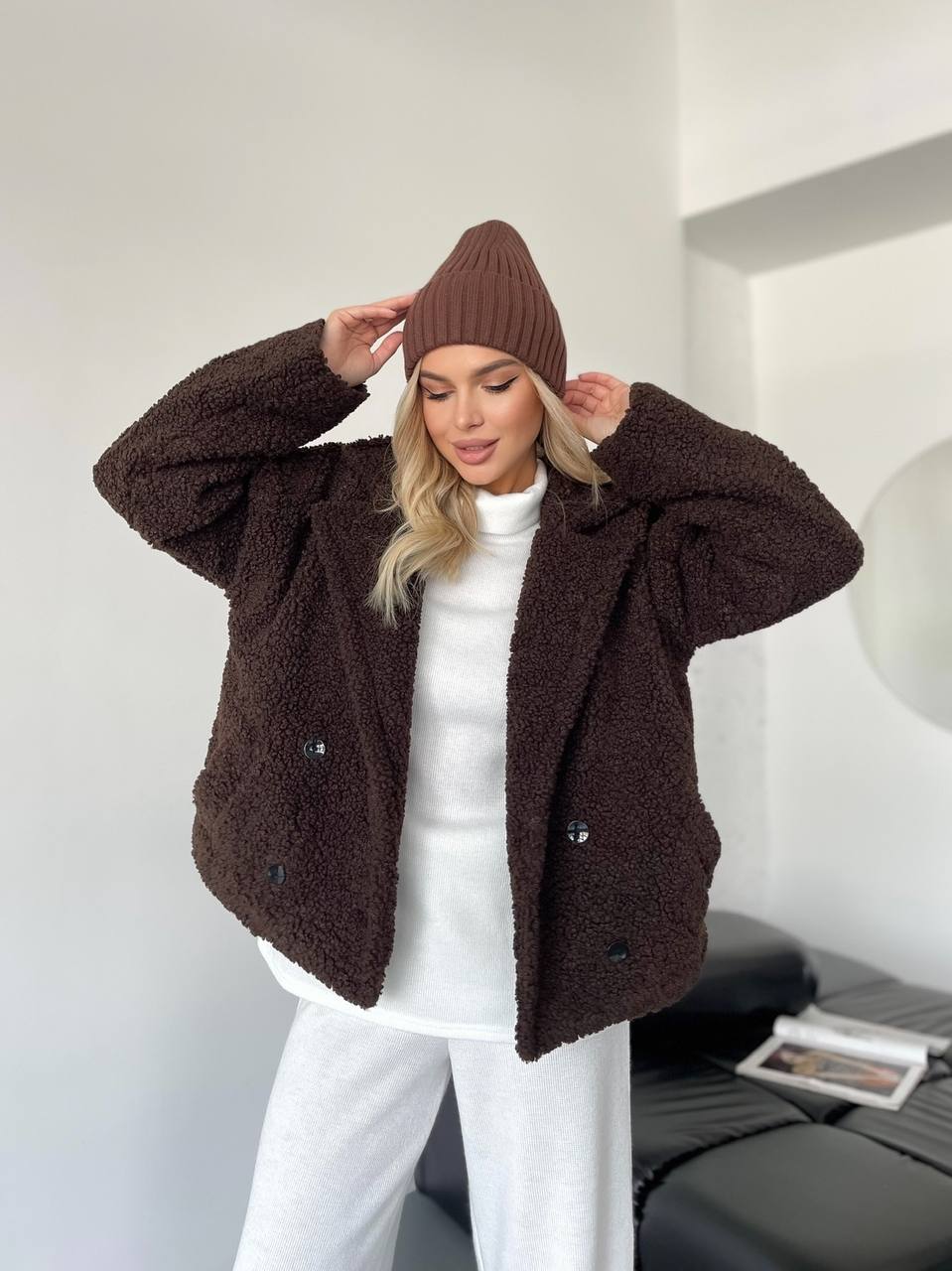 Виконана з щільного теплого хутра Тедді на підкладці — дарує комфорт і тепло навіть у прохолодну погоду. Вільний силует та спущена лінія плеча створюють стильний oversize-ефект, який легко поєднується з джинсами, сукнями чи трикотажними костюмами.