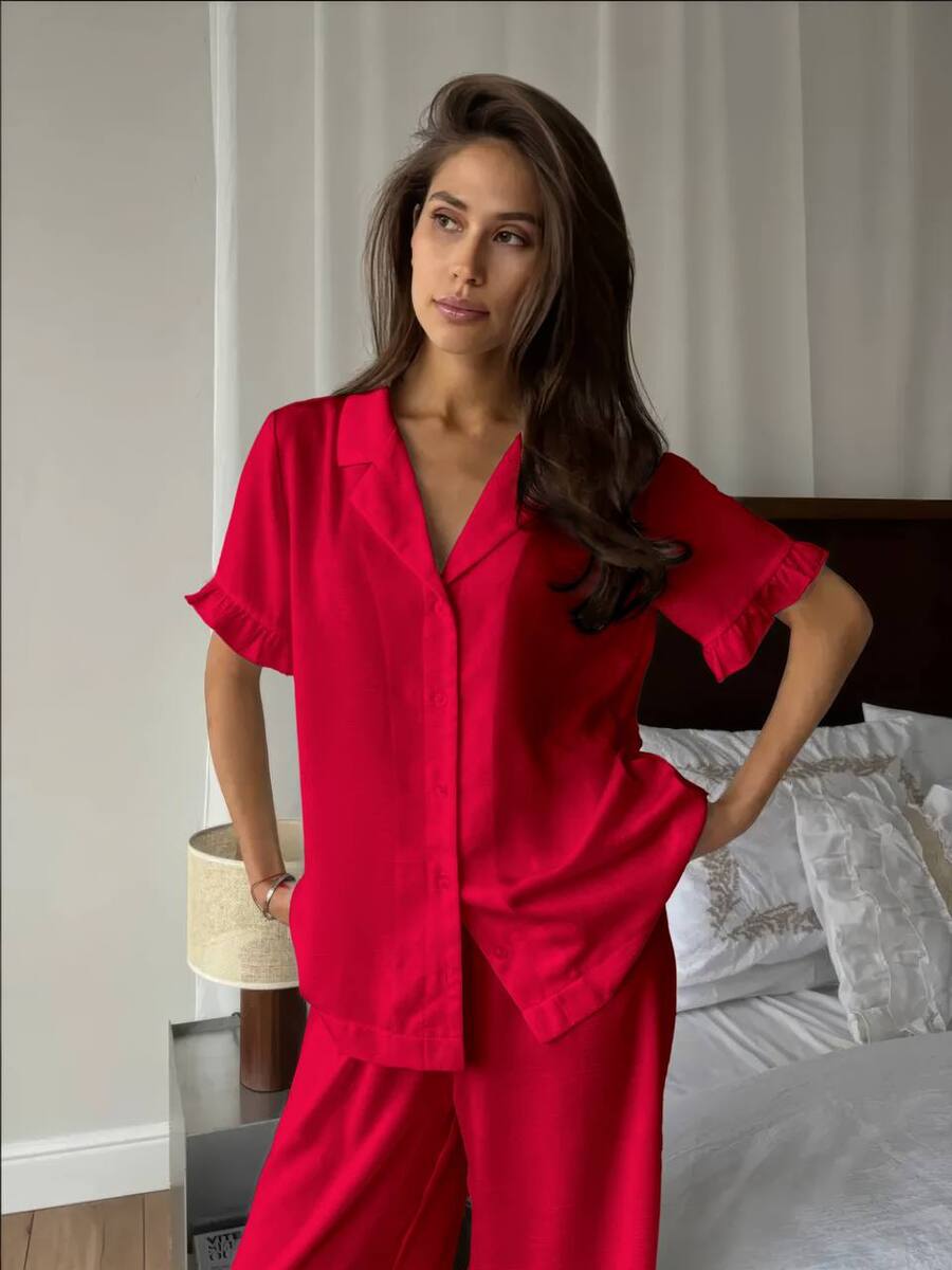 • Низ: штани прямого крою з елегантними оборками внизу.