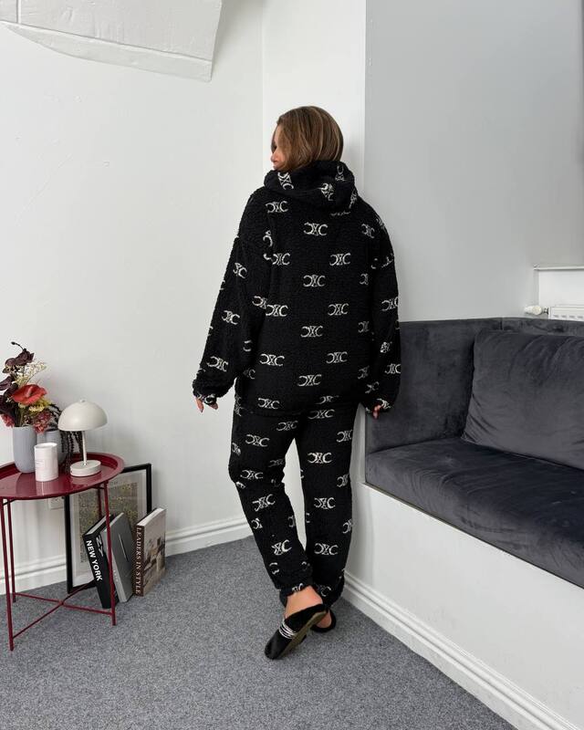 Затишна піжама,що складається з худі з капюшоном та штанів з еластичним поясом і шнурком.
