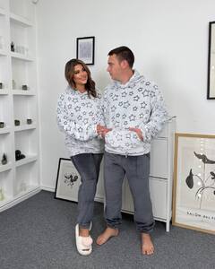 Затишна піжама,що складається з м’якої кофти-кенгуру з капюшоном та штанів на еластичній резинці зі шнурком і кишенями.