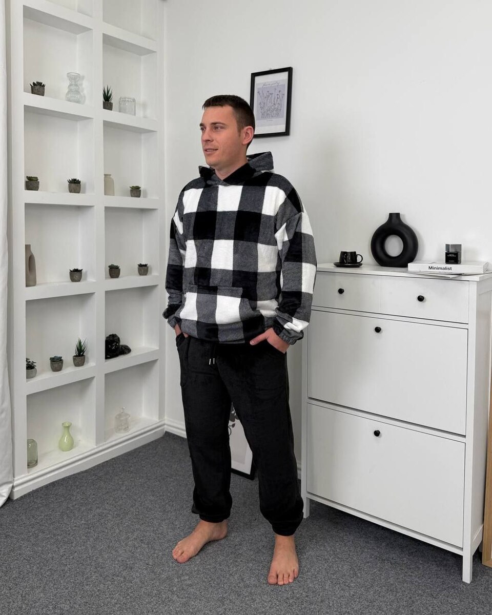 Затишна піжама,що складається з м’якої кофти-кенгуру з капюшоном та штанів на еластичній резинці зі шнурком і кишенями.