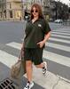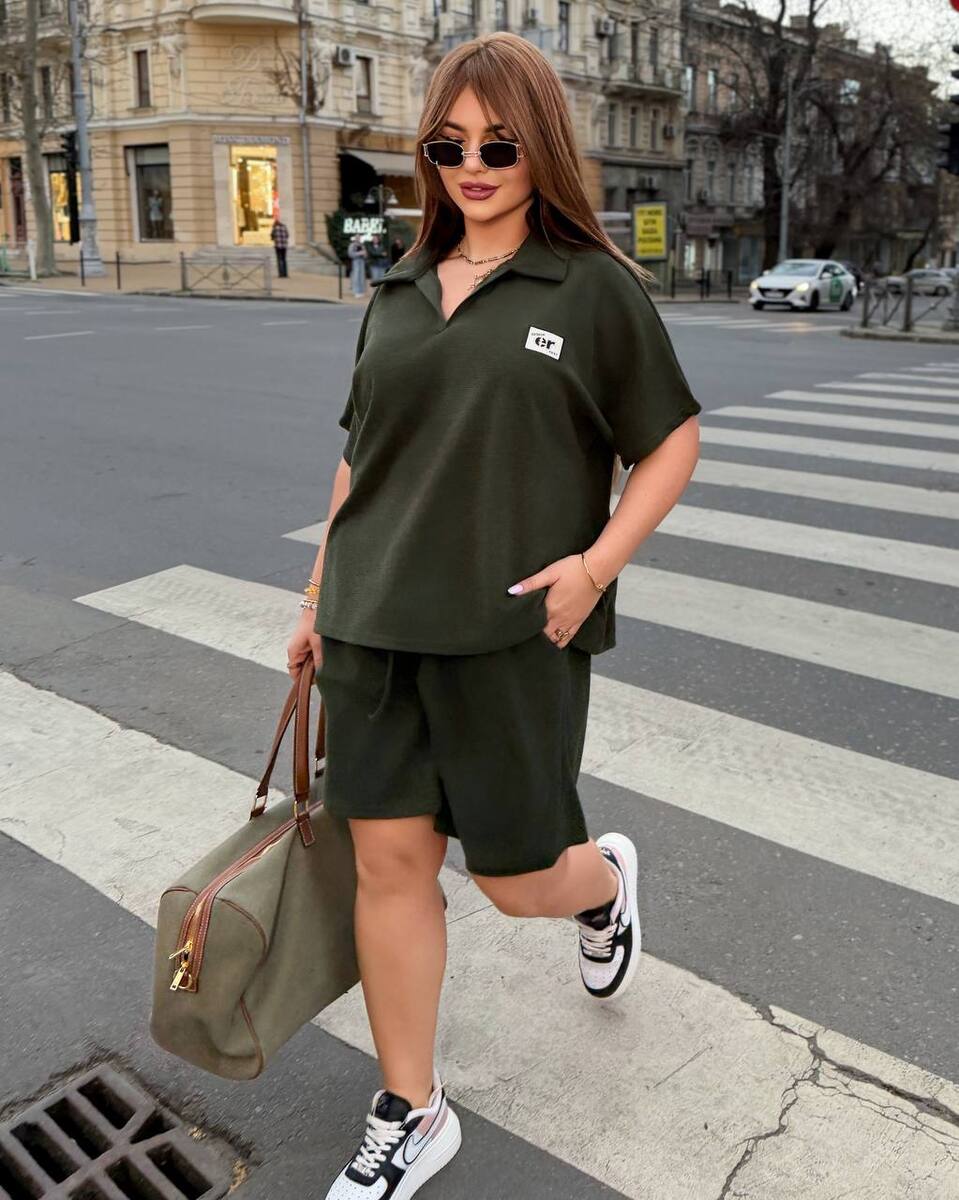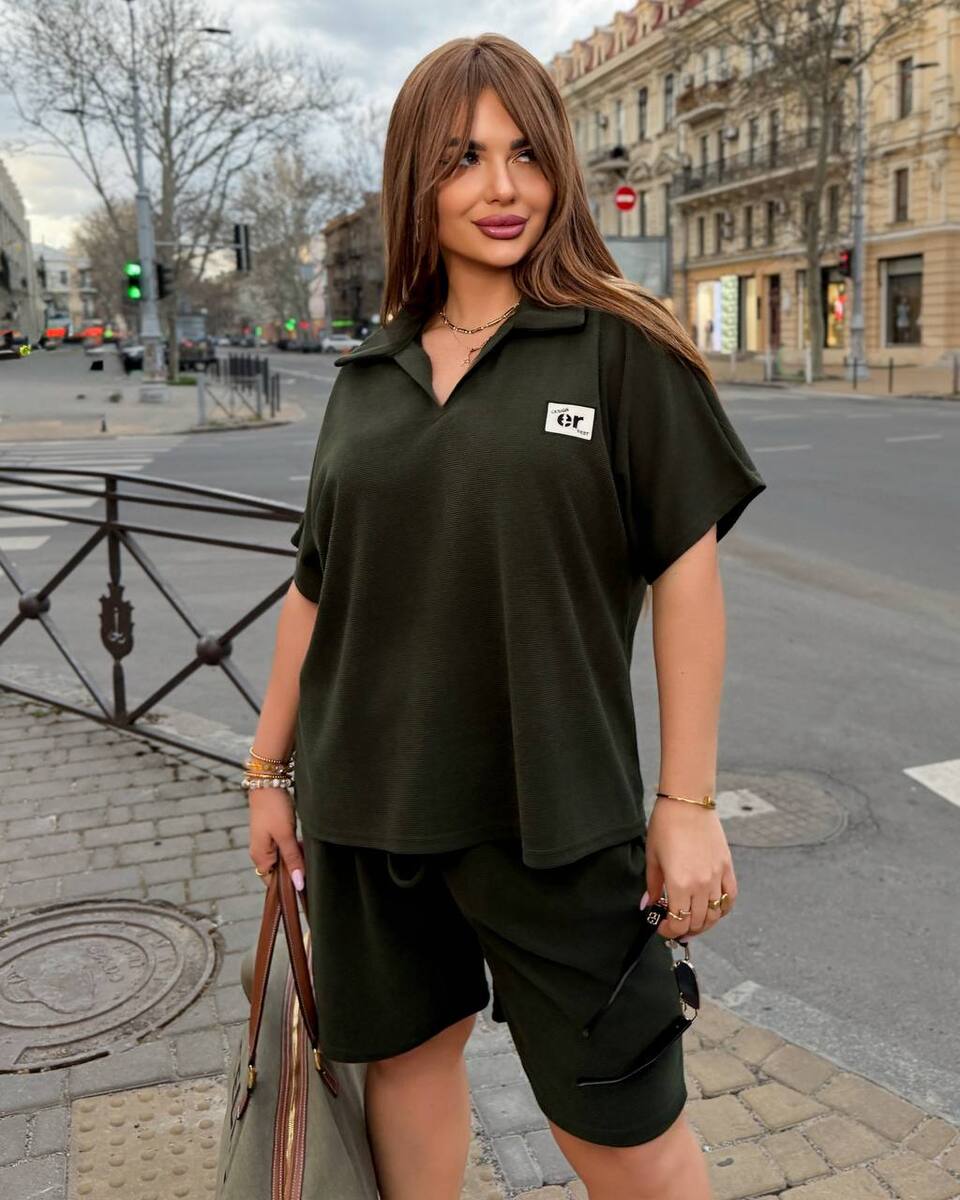 Стильний комфортний костюм з шортами з трикотажу еластан : футболка поло у стилі оверсайз з акс + шорти з високою посадкою з кішенями у бічних швах, з куліскою на поясі