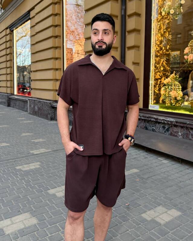 Стильний комфортний костюм з шортами з трикотажу еластан : футболка поло у стилі оверсайз з акс + шорти з високою посадкою з кішенями у бічних швах, з куліскою на поясі