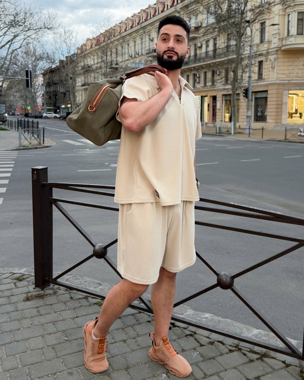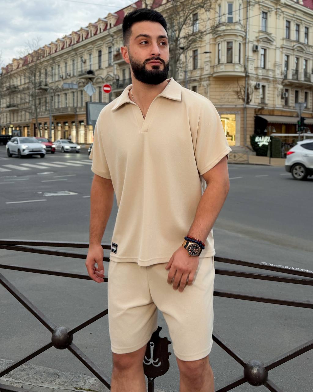 Стильний комфортний костюм з шортами з трикотажу еластан : футболка поло у стилі оверсайз з акс + шорти з високою посадкою з кішенями у бічних швах, з куліскою на поясі