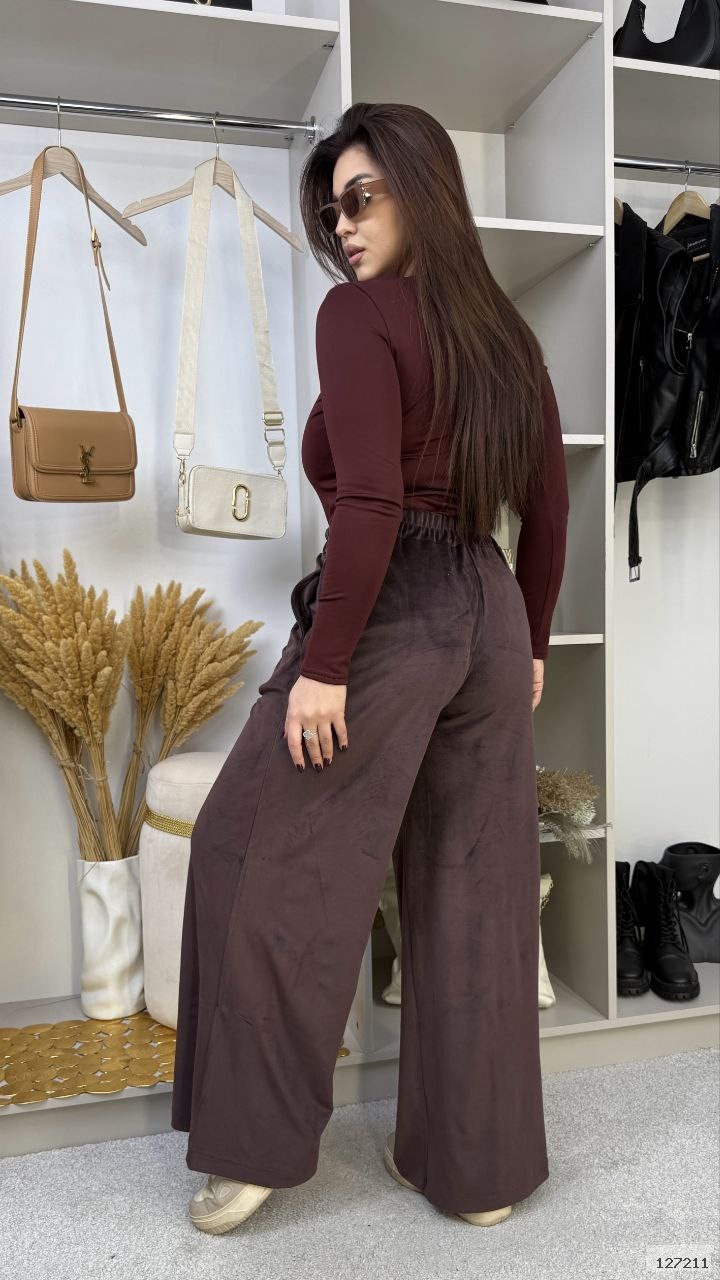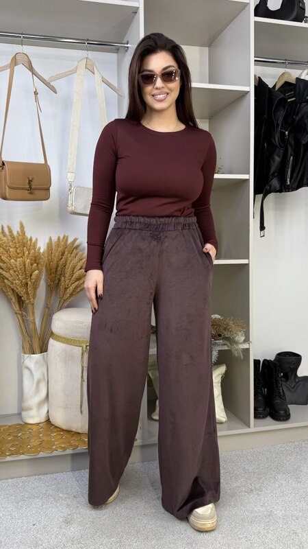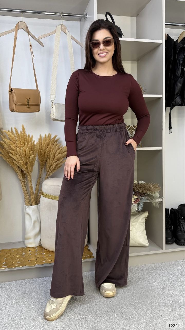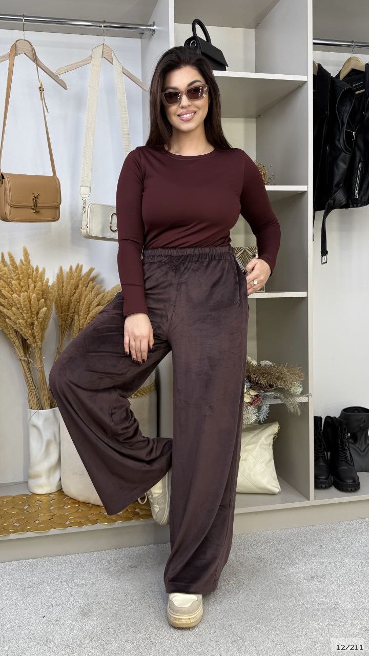 Брюки з королівського велюру красиво струмують, додаючи образу вишуканості. М’яка посадка на резинці + кишені = стиль та зручність в одному