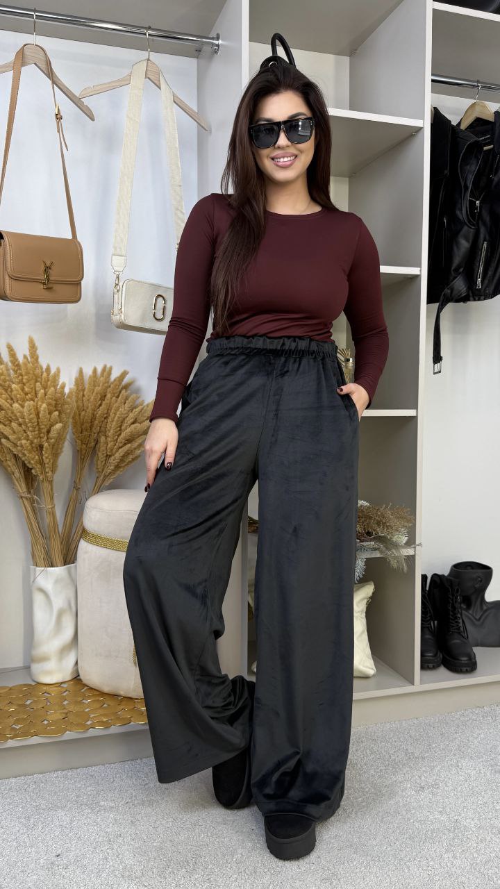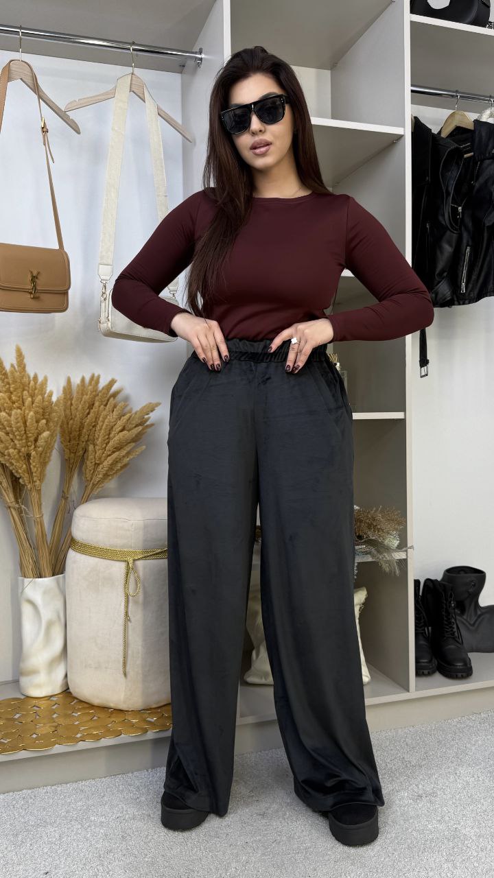 Брюки з королівського велюру красиво струмують, додаючи образу вишуканості. М’яка посадка на резинці + кишені = стиль та зручність в одному