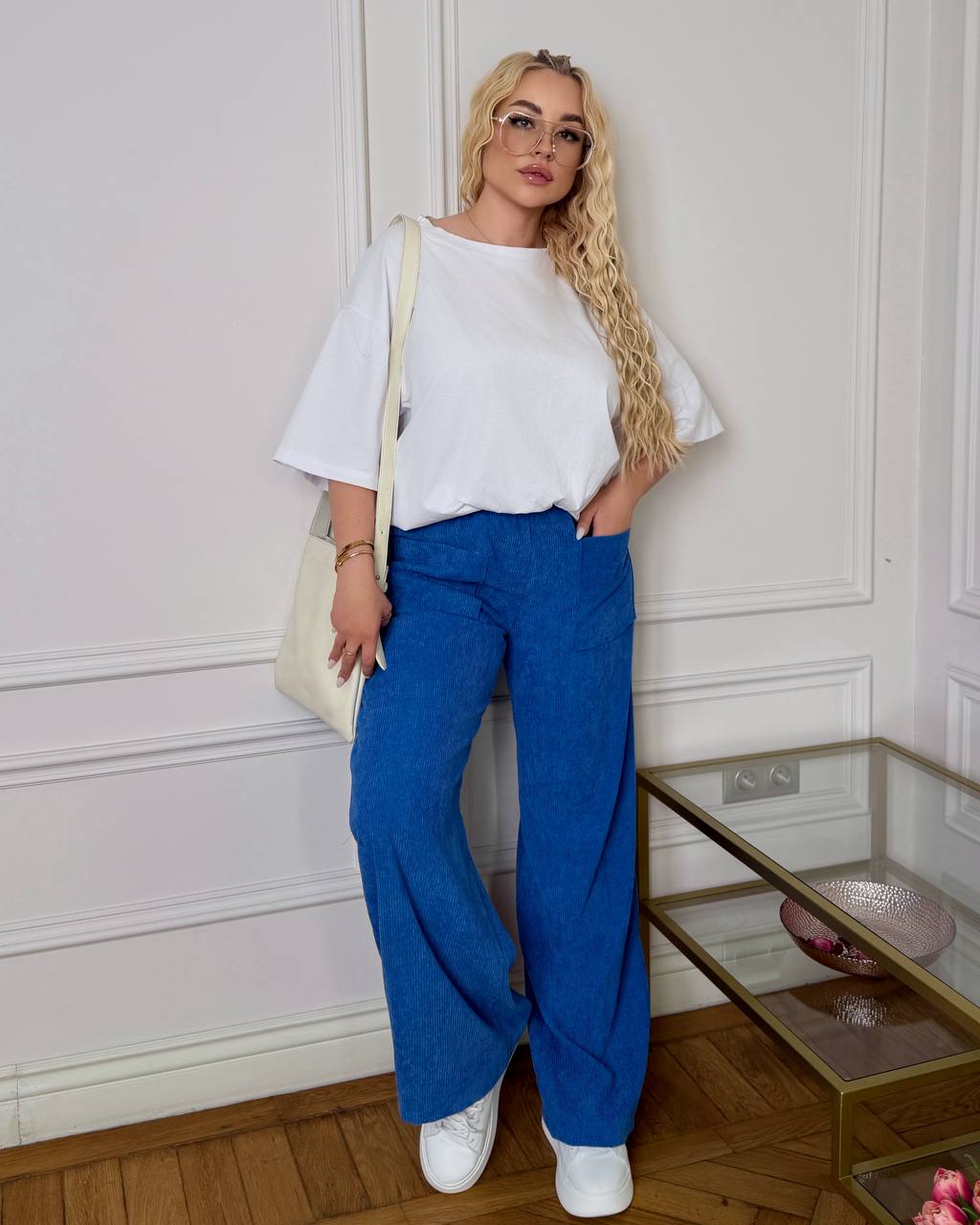 Жіночі брюки вільного крою з м’якого вельвету в розслабленому casual-стилі. Модель із високою посадкою та зручною еластичною резинкою на талії, що забезпечує комфорт і гарно підкреслює силует. Широкі прямі штанини красиво струмують та візуально подовжують ноги. Спереду — великі накладні кишені, які додають практичності та стильного акценту .
