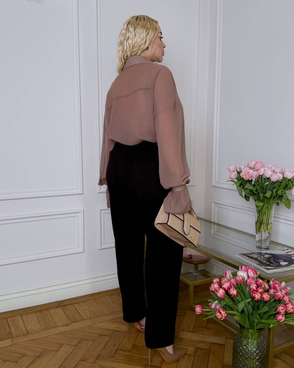 Брюки злегка завужені донизу, вільного крою. Виконані з вельвету в широкий рубчик. Посадка середня, спереду є м’які складки, що додають об’єму в зоні стегон. Ззаду — накладні кишені. Тканина виглядає щільною, але м’якою, що забезпечує комфорт та тримає форму. Стиль — casual, з легким ретро-акцентом
