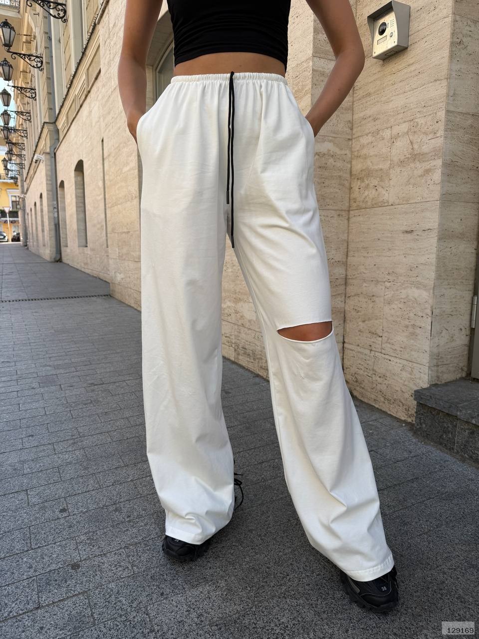 Штани прямого силуету на резинці, з ефектним розрізом на коліні — трендовий акцент, що додає зухвалості та стилю. Легка натуральна тканина дарує комфорт у спекотні дні