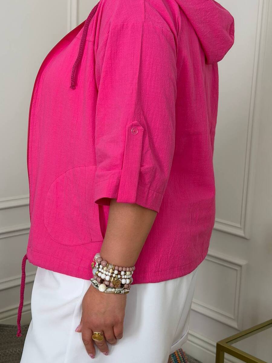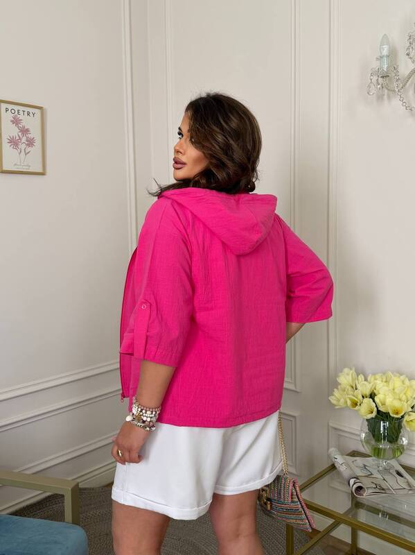 Блуза із дуже класної мʼякої натуральної тканини на блискавці, із капюшоном та кишенями. Рукав застібається на ґудзик. В капюшоні та по низу блузи є канати.
