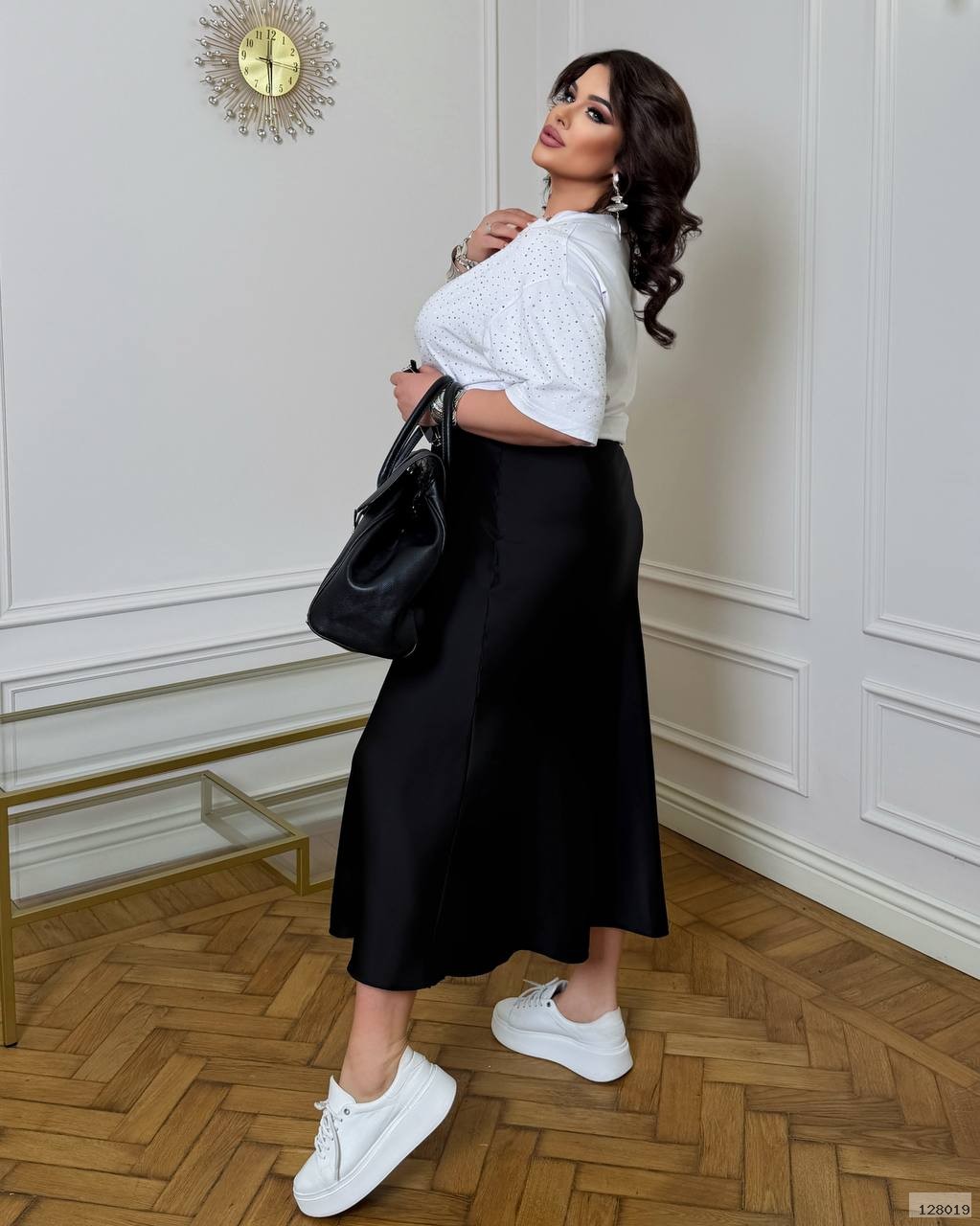 Елегантна та жіночна спідниця довжини міді, яка додає образу легкості та витонченості. Атласна тканина красиво переливається на світлі та м’яко лягає по фігурі, створюючи стильний і сучасний образ.