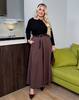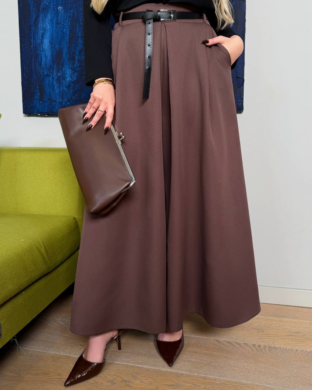СПІДНИЦЯ-БРЮКИ - модний тренд сезону додає жіночності та елегантності образу. Вільний крій складки по переду ,висока талія , пояс частково на гумці. Шльовки , пояс з еко шкіри в комплекті Косі кишені в бічних швах.