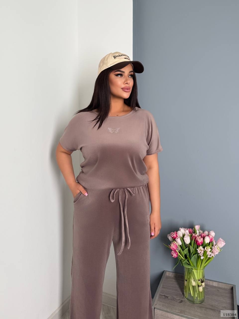 Футболка вільного крою,з короткими рукавами та округлим вирізом.Штани широкі,зручні,на резинці та зав’язках.На футболці й штанах метелики із каміння.