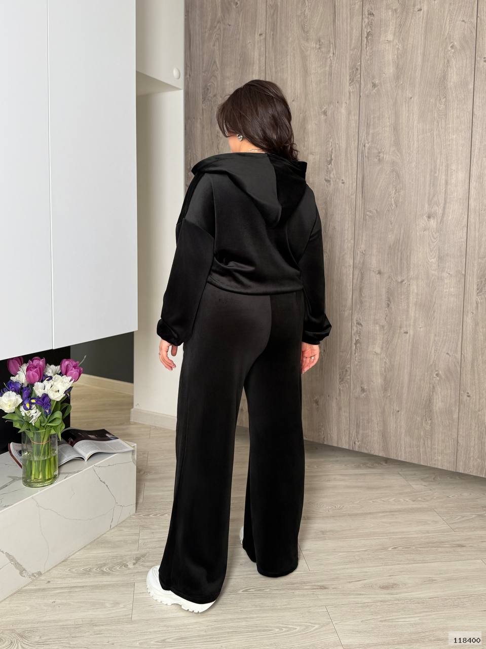 Кофта вільна,з капюшоном,на блискавці,з манжетами й декоративними елементами.Штани широкі,зручні,на резинці та зав’язках.