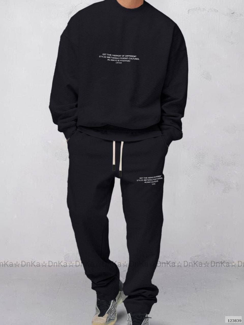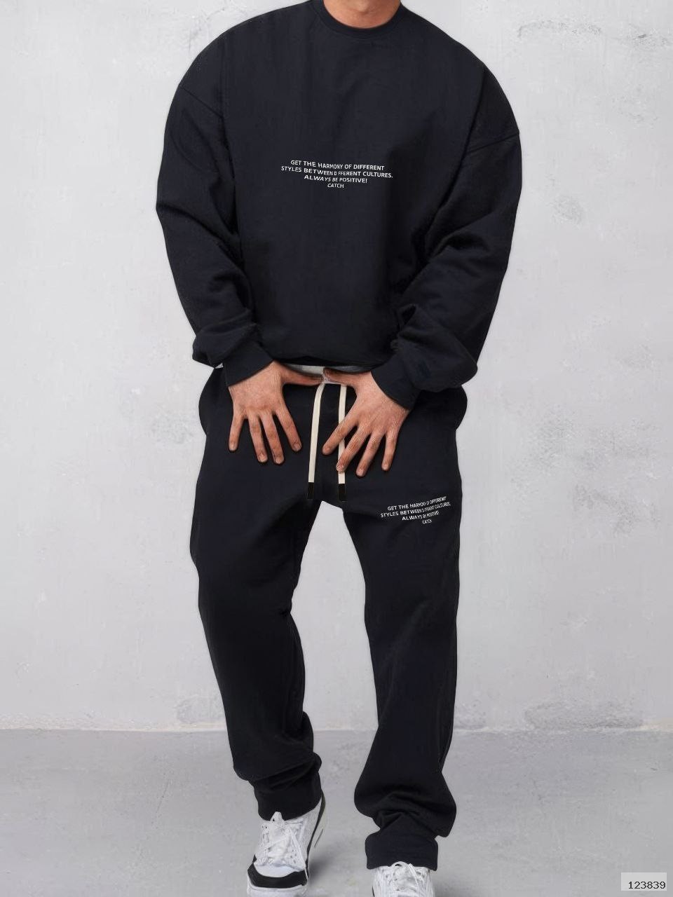 Вільний світшот із круглим вирізом і білим принтом на грудях.Зручні штани на резинці зі шнурком та додатковим принтом.Ззаду є дві функціональні кишені