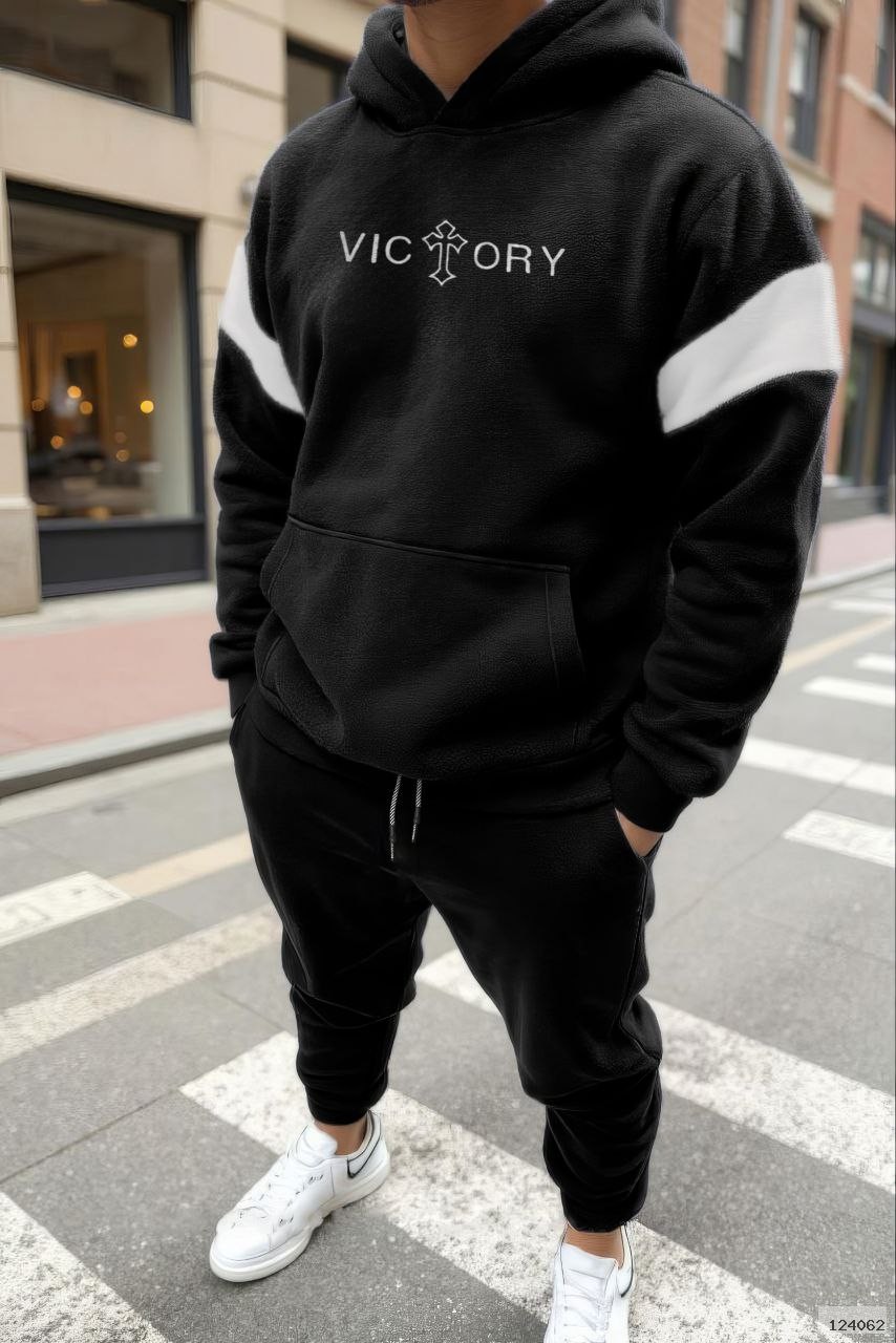 Худі з капюшоном і кишенею-кенгуру,з вишивкою на грудях.Штани з еластичним поясом,бічними кишенями та манжетами на резинці внизу.