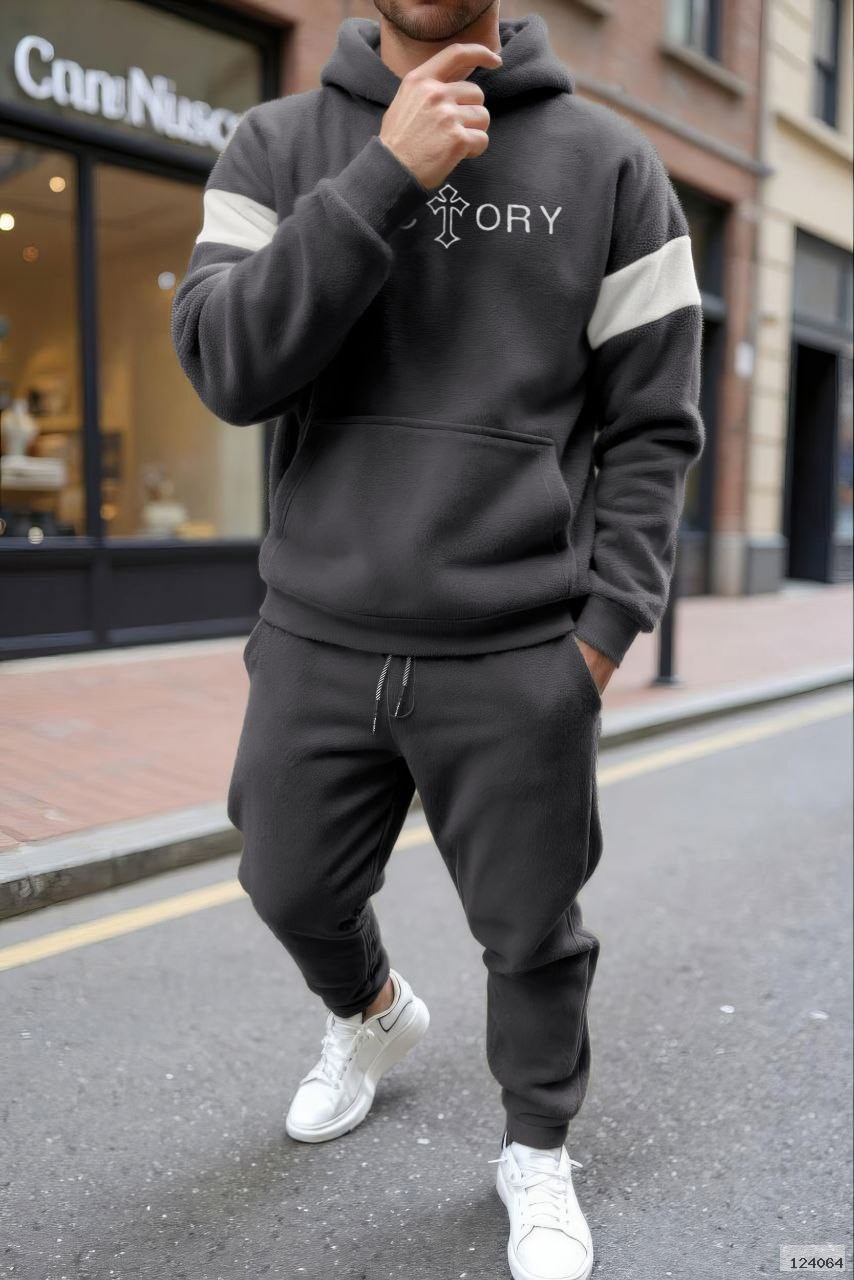 Худі з капюшоном і кишенею-кенгуру,з вишивкою на грудях.Штани з еластичним поясом,бічними кишенями та манжетами на резинці внизу.
