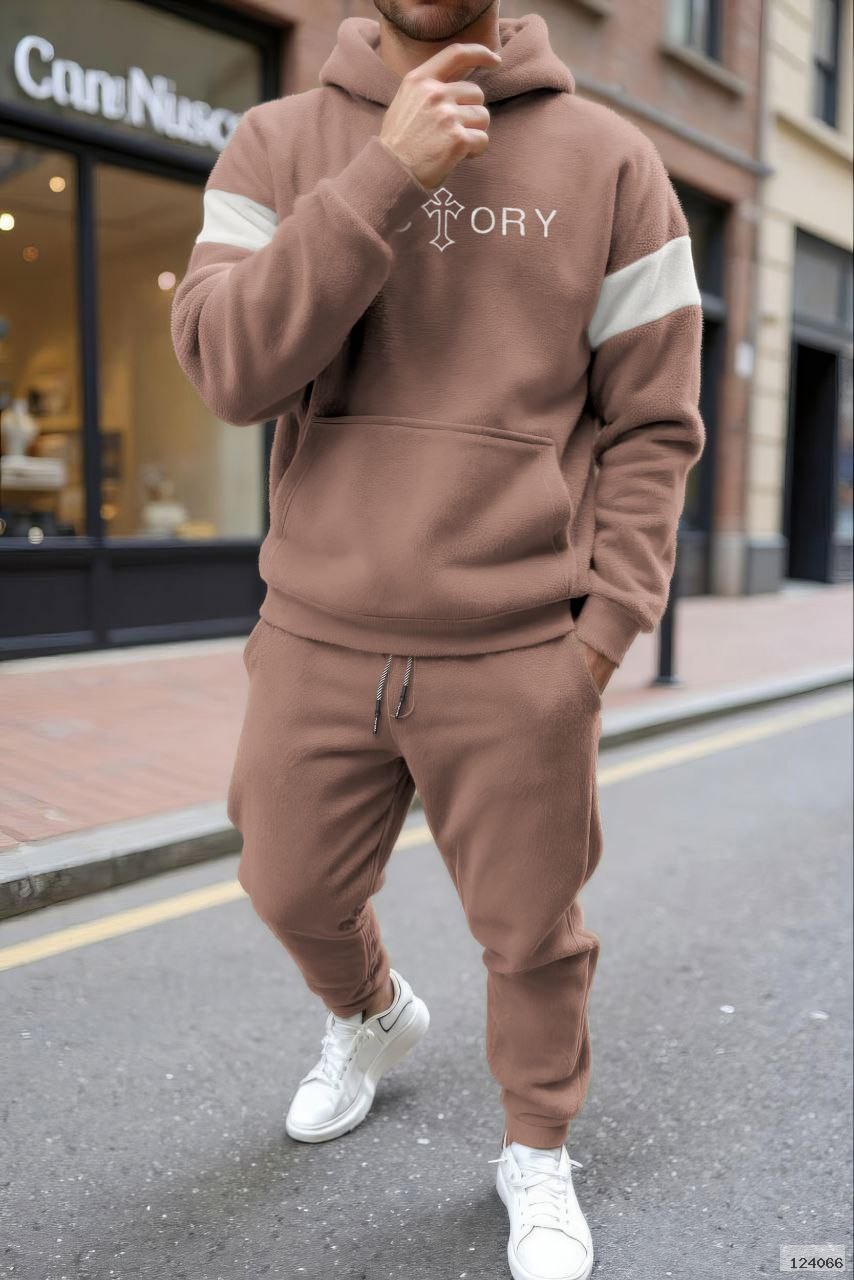 Худі з капюшоном і кишенею-кенгуру,з вишивкою на грудях.Штани з еластичним поясом,бічними кишенями та манжетами на резинці внизу.