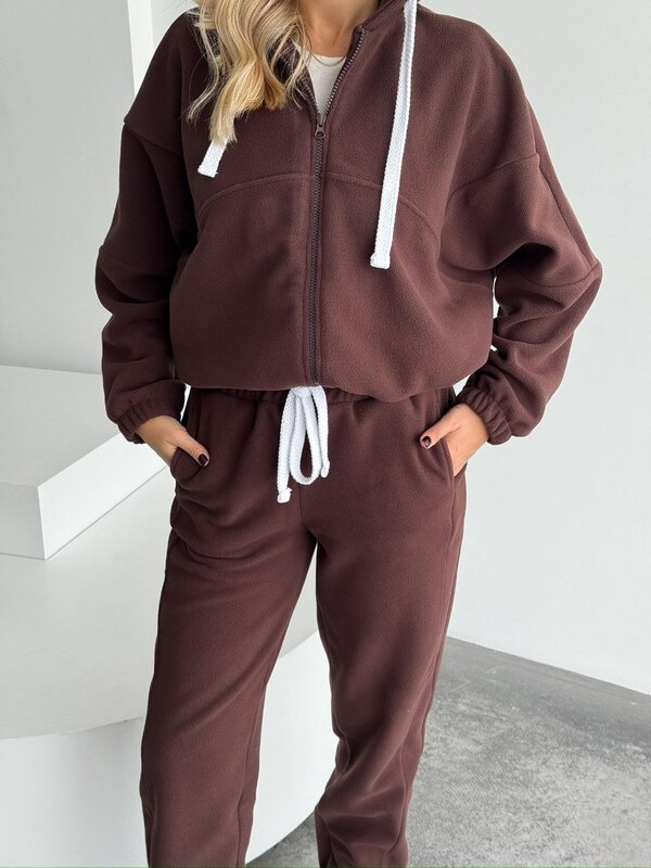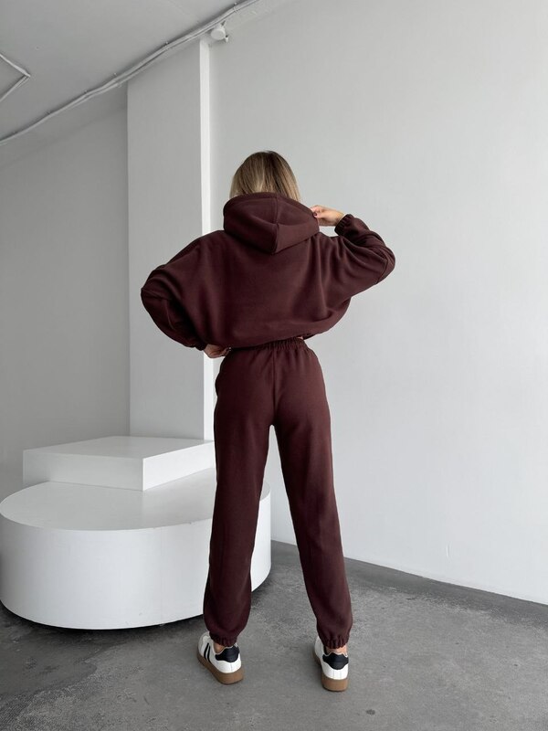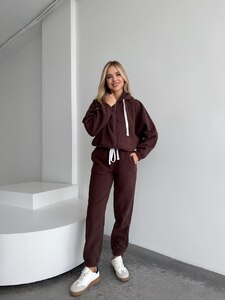 Теплий костюм в деталях, зі штанами джогерами і кофтою на зіпці та понизу на кулісках, подвійним капюшоном. Костюм високої якості і пошитя, стане незамінним в твоєму гардеробі.