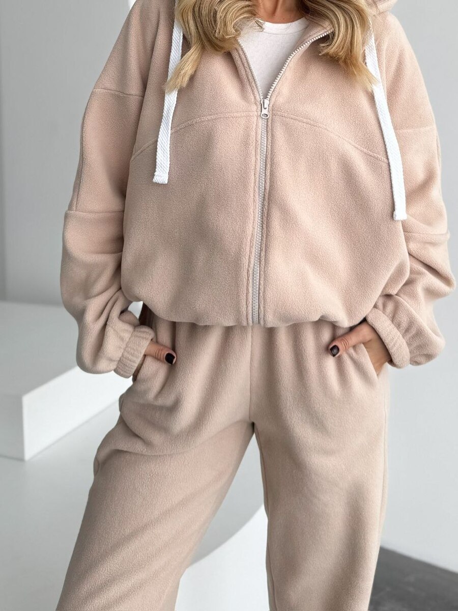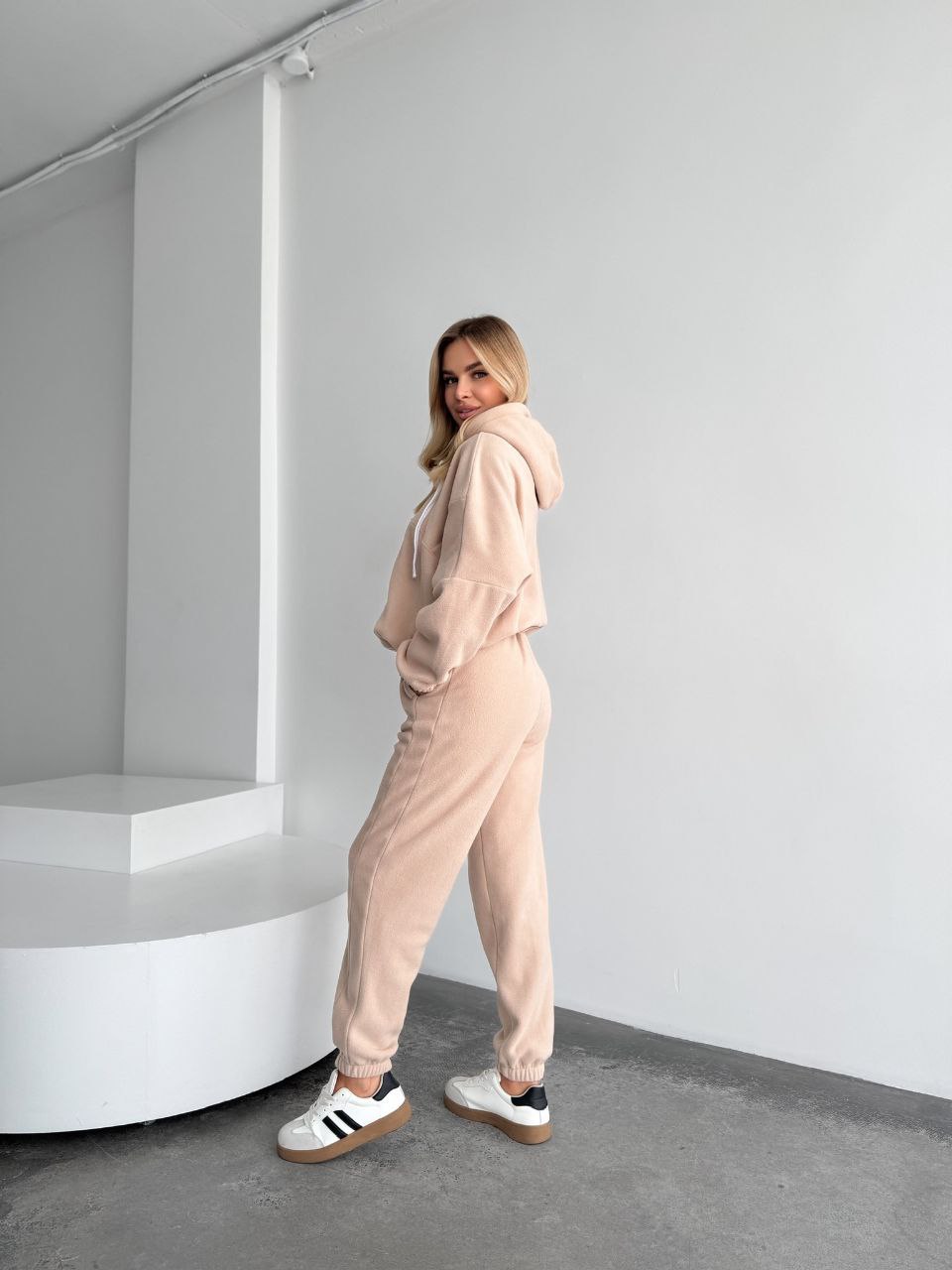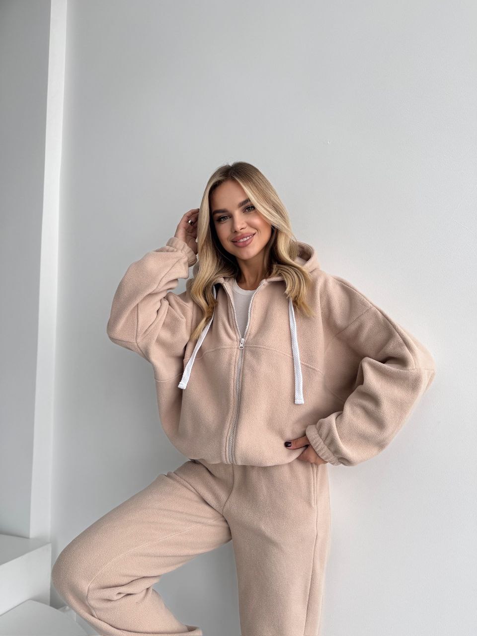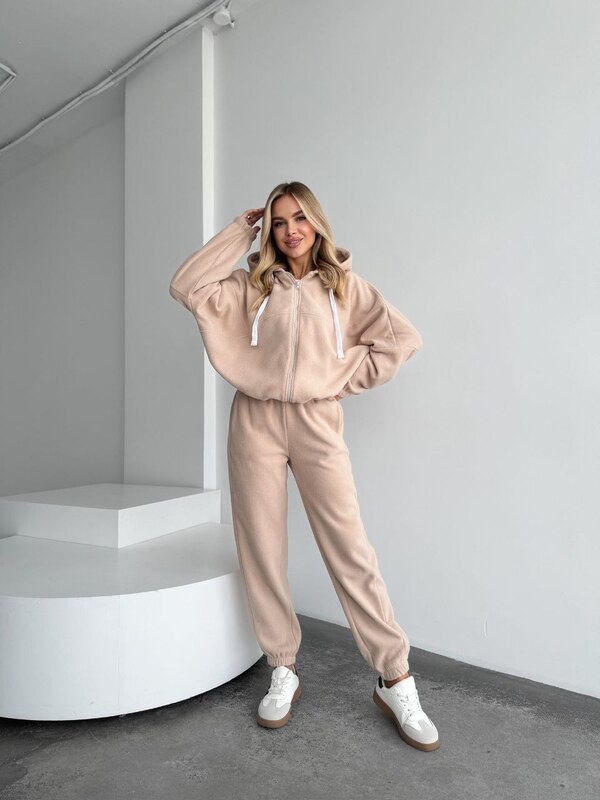 Теплий костюм в деталях, зі штанами джогерами і кофтою на зіпці та понизу на кулісках, подвійним капюшоном. Костюм високої якості і пошитя, стане незамінним в твоєму гардеробі.