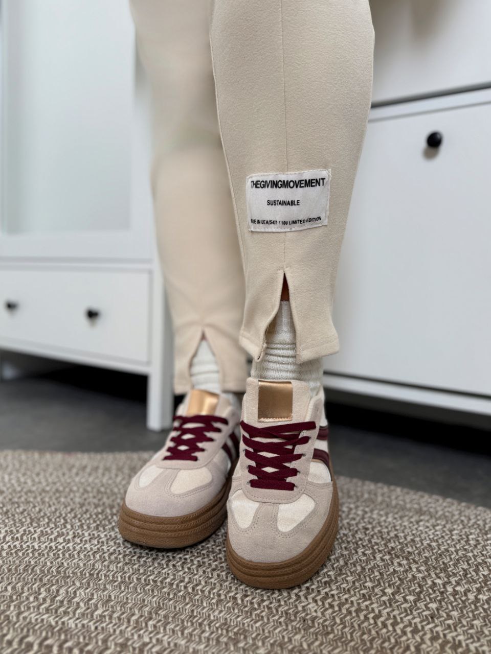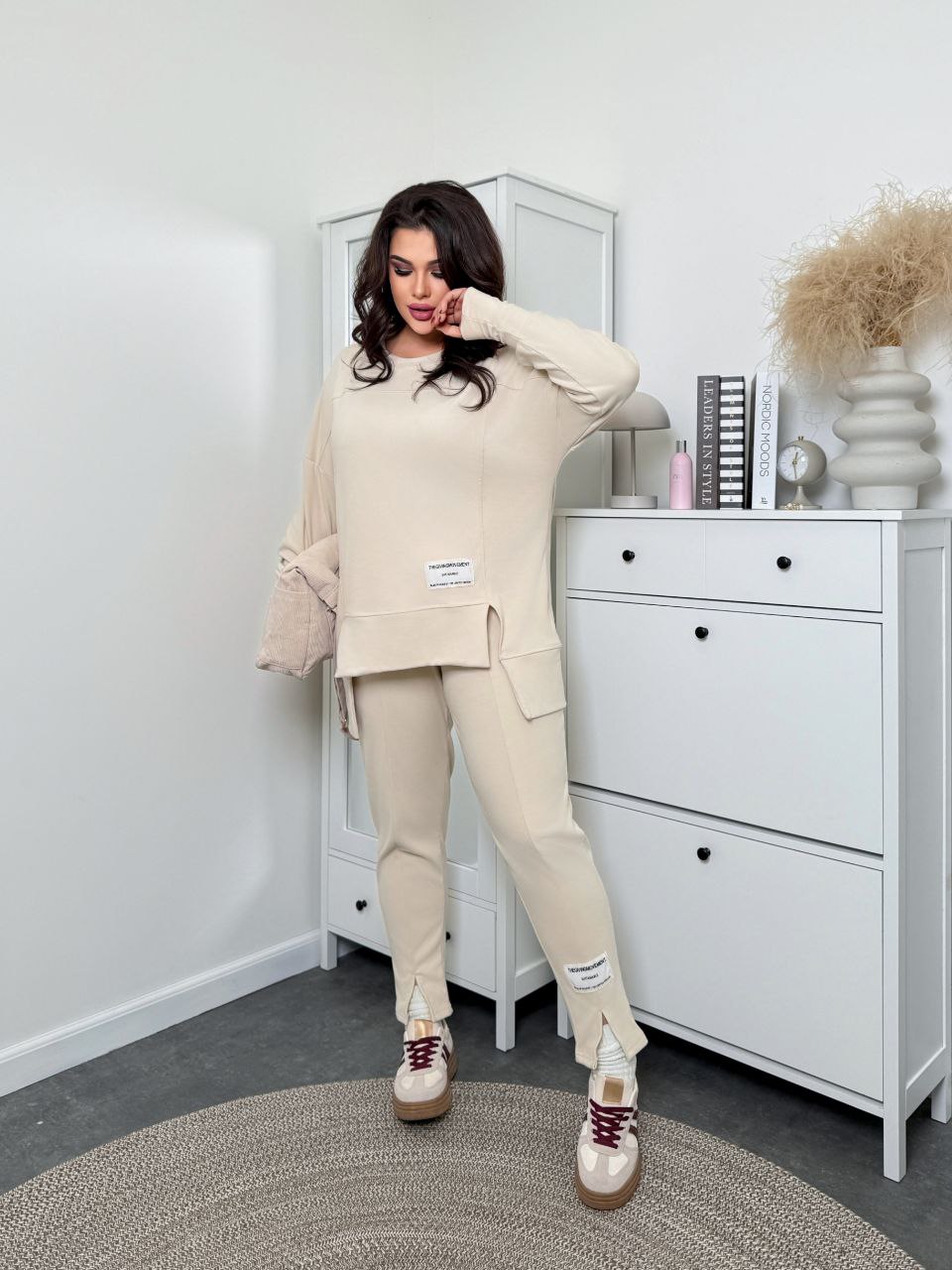Тканина еластична, має гарну розтяжність. Костюм декорований нашивками, кофта вільна, ззаду подовжена.