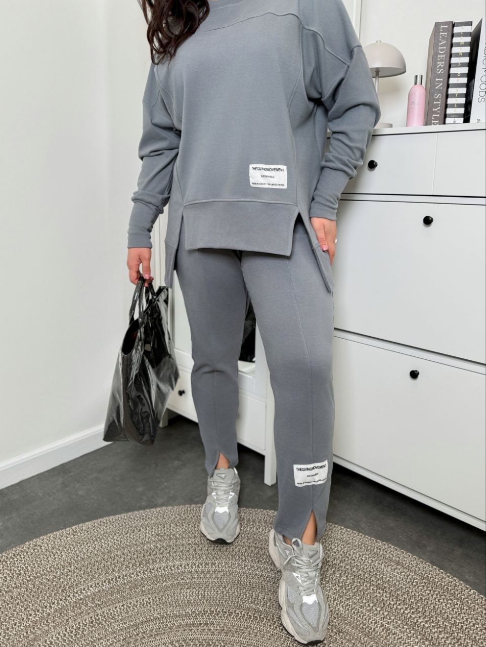 Тканина еластична, має гарну розтяжність. Костюм декорований нашивками, кофта вільна, ззаду подовжена.