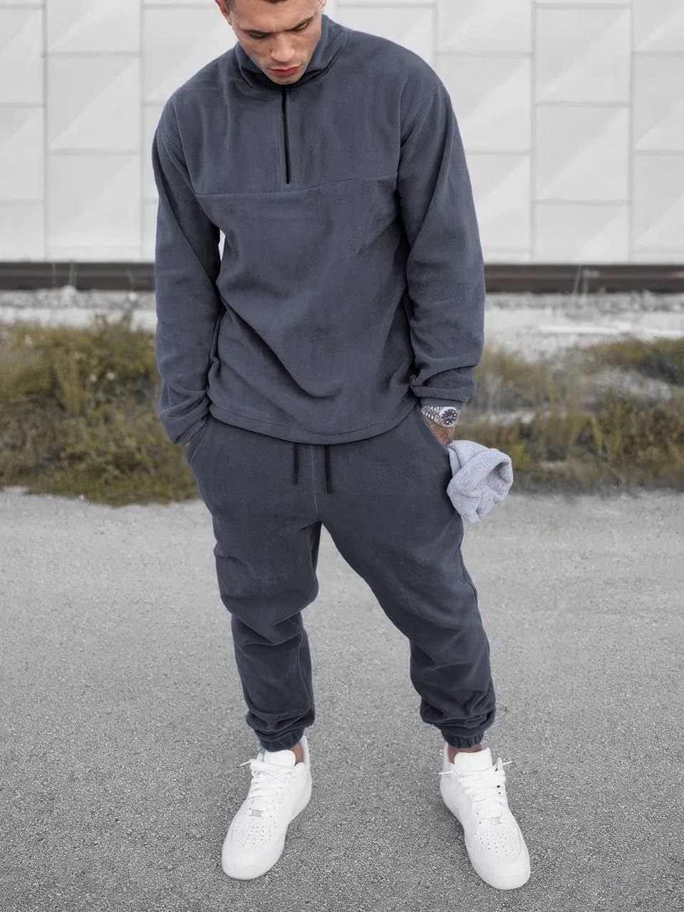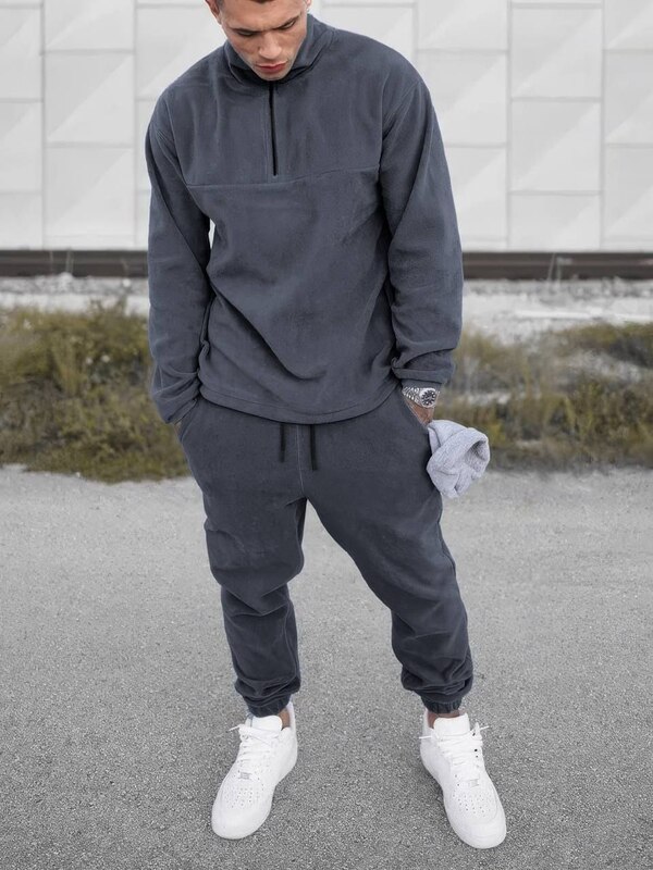 Верх костюма має високий комір на блискавці,що додає практичності й забезпечує додатковий захист від вітру.Штани виконані у вільному стилі з еластичним поясом зі шнурком.